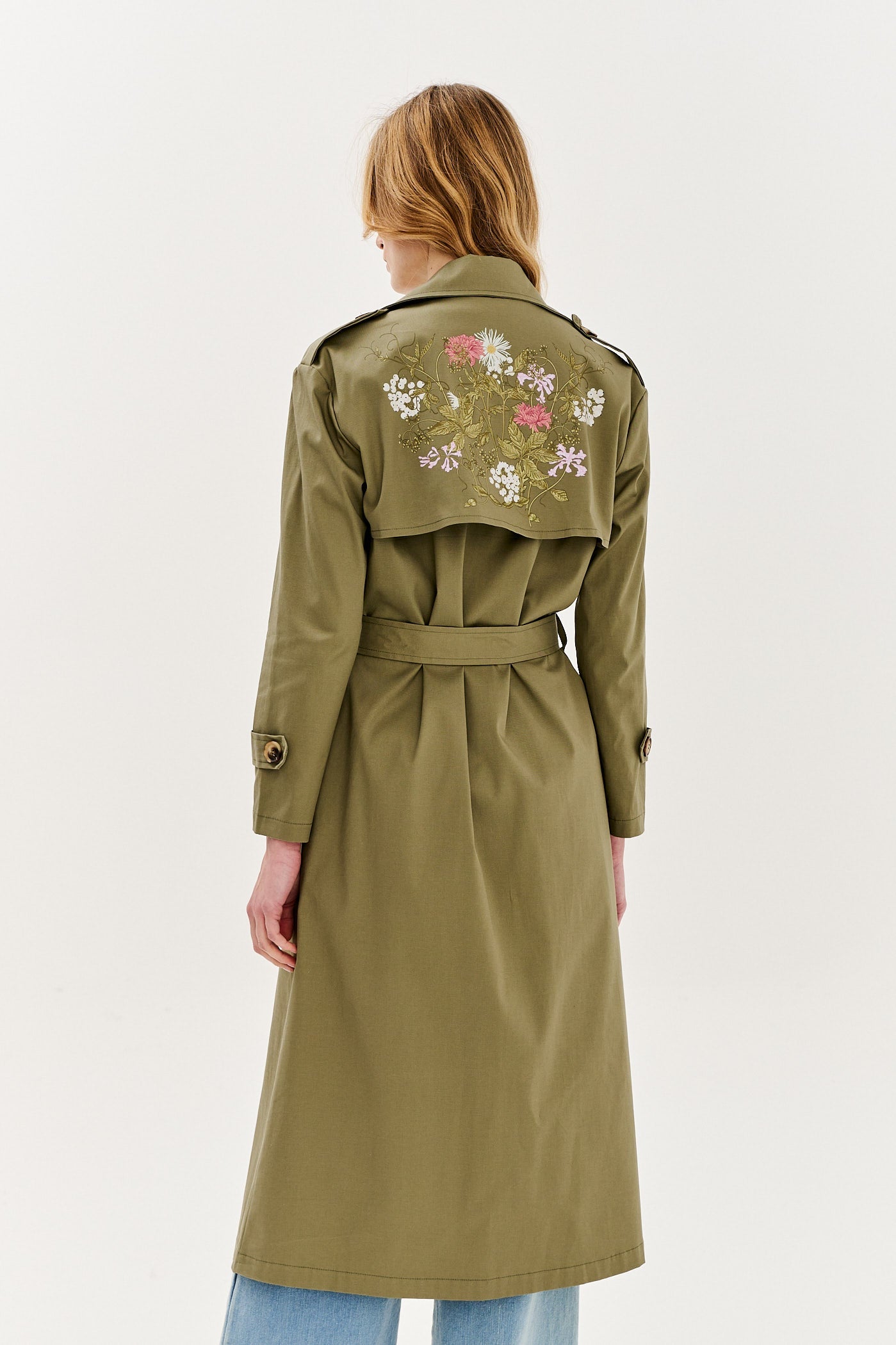 Subtil und doch ausdrucksstark – der Meadow Glow klassische Trenchcoat ist ein Klassiker, der einen neuen und einzigartigen Charakter annimmt. Inspiriert vom erwachenden Frühling, vereint er zeitlose Eleganz mit zarten floralen Details. In einem tiefen Waldgrün gehalten, ruft dieser Mantel die Ruhe und Harmonie der Natur hervor. Sorgfältig gefertigte Stickereien und Drucke in Form von Feldblumen verleihen jedem Outfit eine romantische und zugleich anspruchsvolle Note.