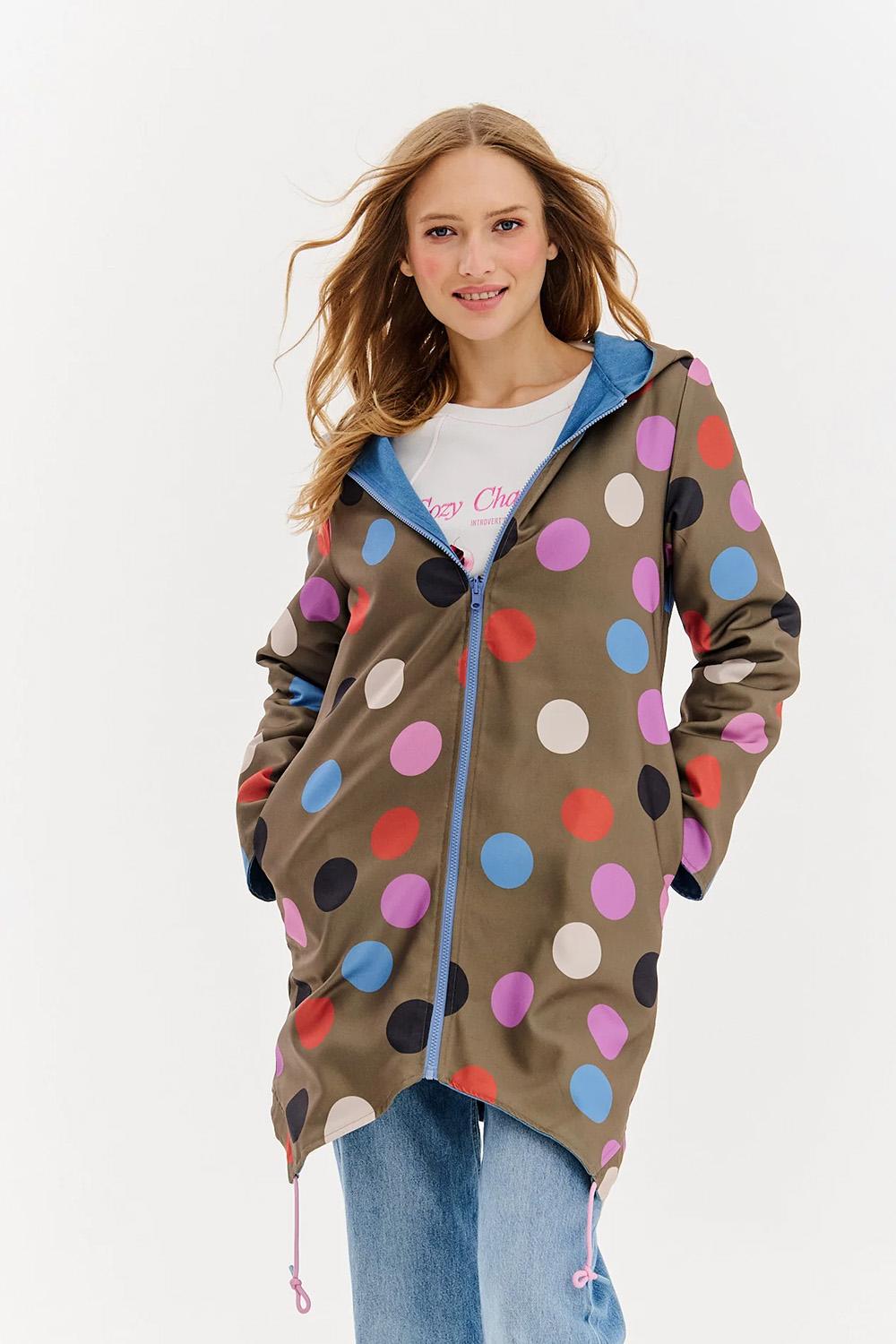 Moon Dots Wendeparka ist ein Mantel, der mit Originalität überrascht und es Ihnen ermöglicht, jeden Tag mit Mode zu spielen. Auf der einen Seite zieht er mit seinem energiegeladenen, farbenfrohen Tupfenmuster auf olivgrünem Hintergrund die Blicke auf sich; auf der anderen Seite begeistert er mit einem ruhigen blauen Finish und einer inspirierenden Botschaft auf dem Rücken: "Chase the stars, dance with the moon and never look back." Es ist ein Vorschlag für alle, die gerne ihren Stil wechseln und Wert auf einzigartige Lösungen legen.