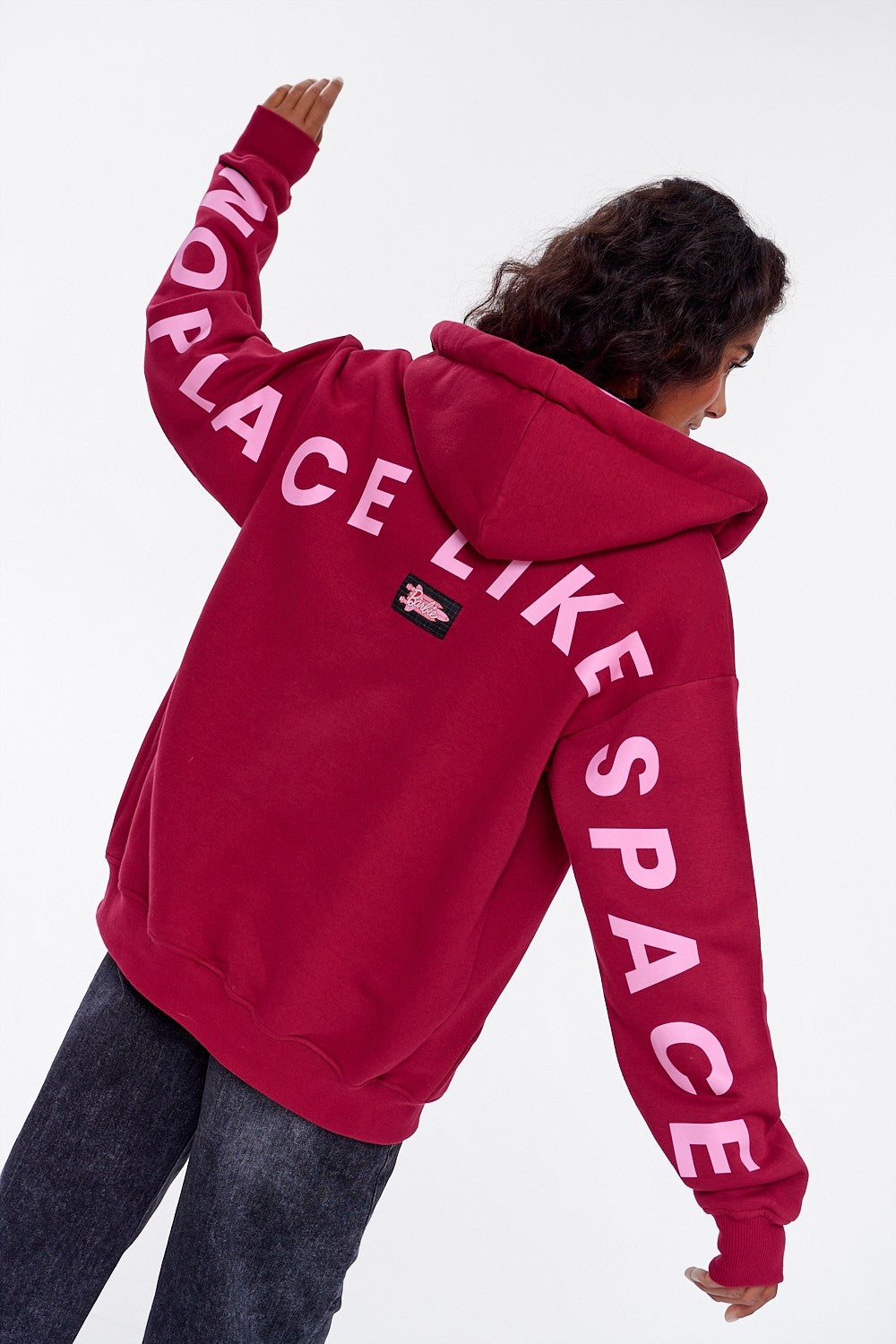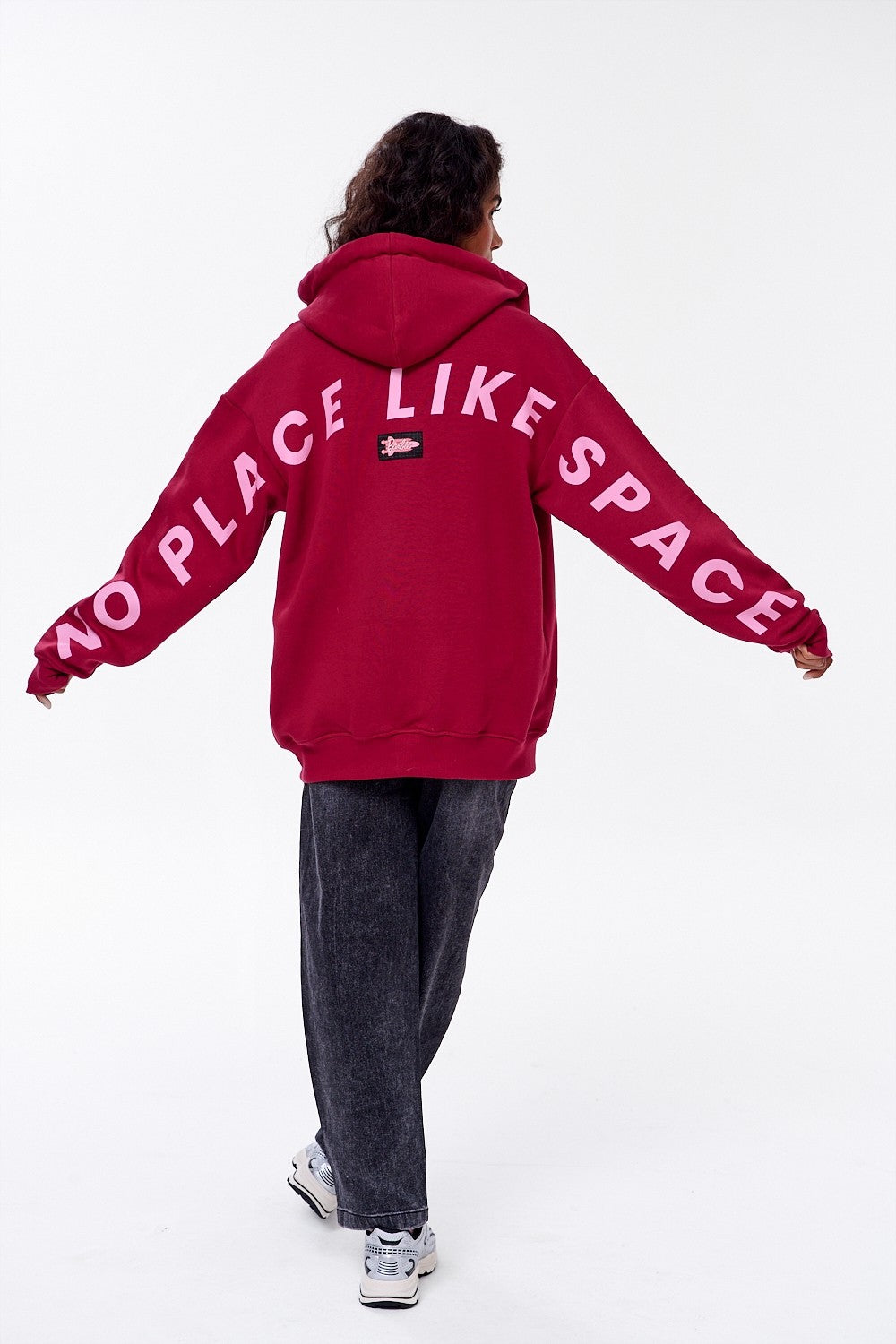 No Place Like Space zip-up sweatshirt is definition of comfort in a stylish way. Its relaxed, oversized cut makes it incredibly comfortable. main burgundy color is broken up by a pink hood lining and multicolored, thick drawstrings.