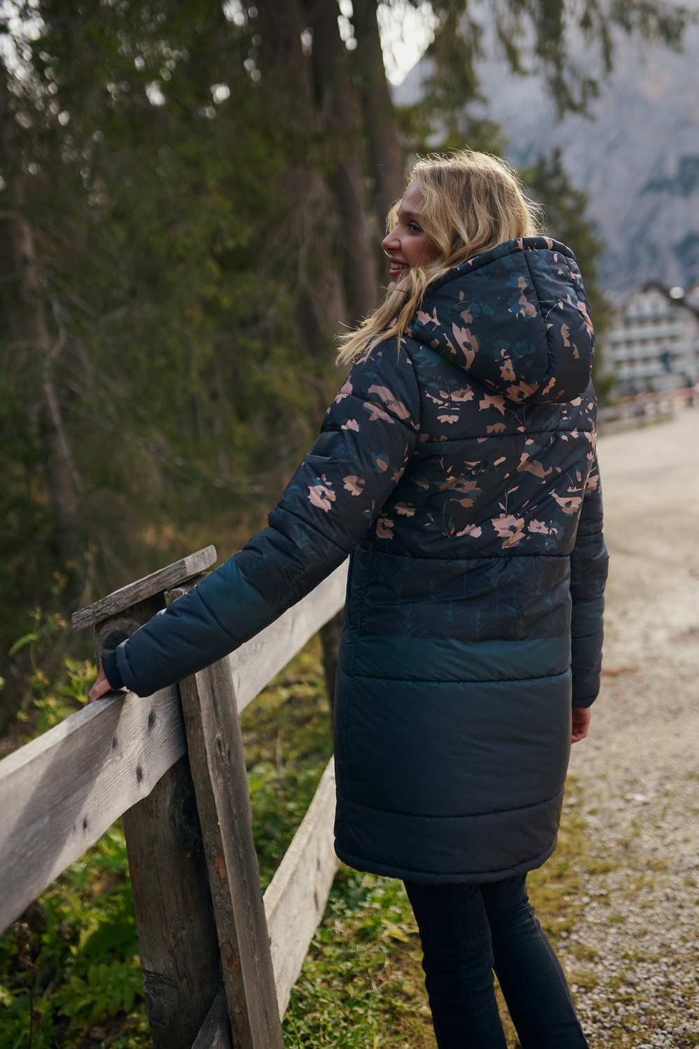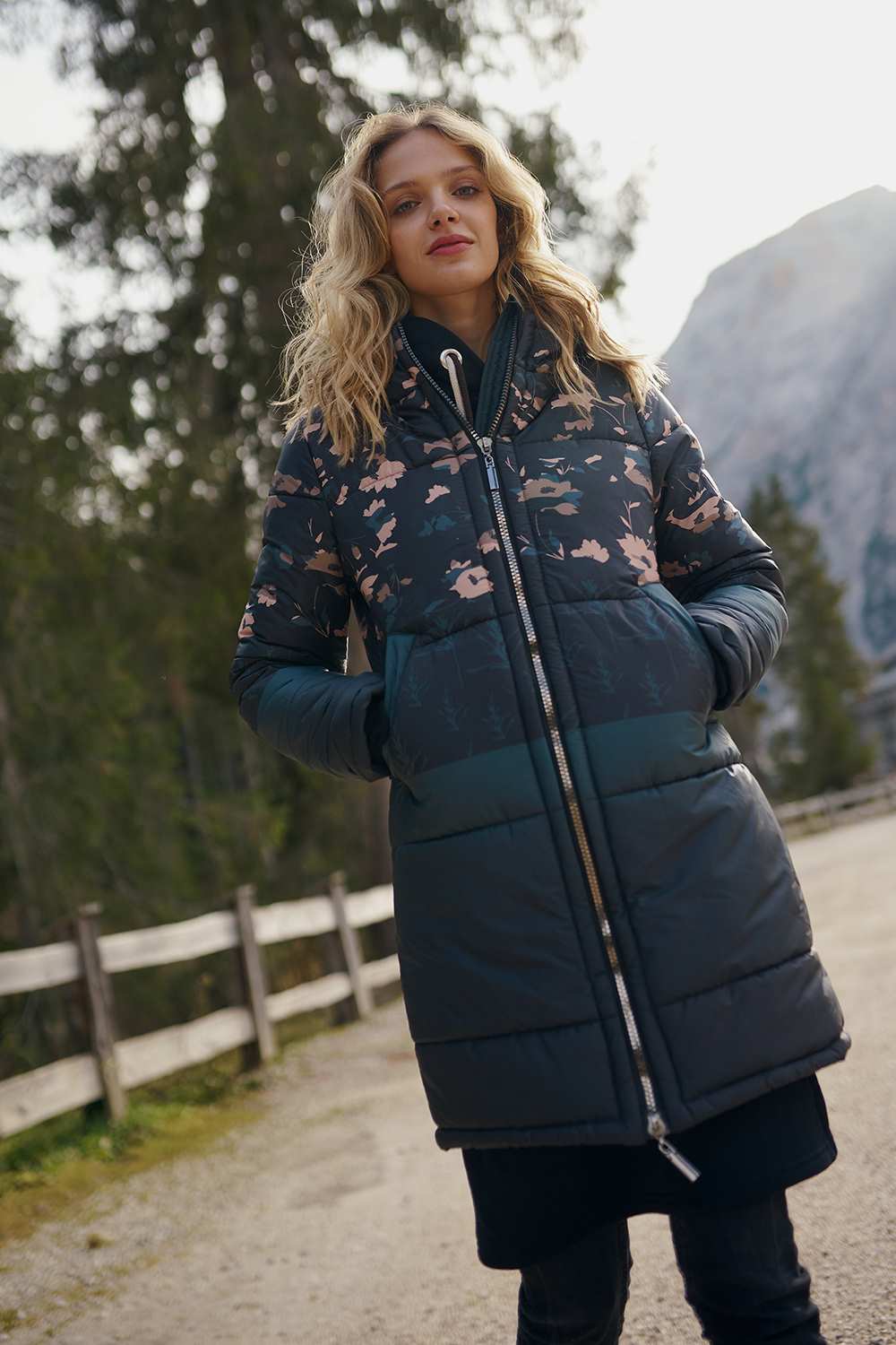 Eine Winterjacke von NAOKO muss dieses "gewisse Etwas" haben – hier ist es die Kombination aus gestepptem, dunkelgrünem Material mit einem floralen, vielfältigen Print. Die Jacke ist einerseits dezent, hat aber auch einen originellen, markanten Akzent.
