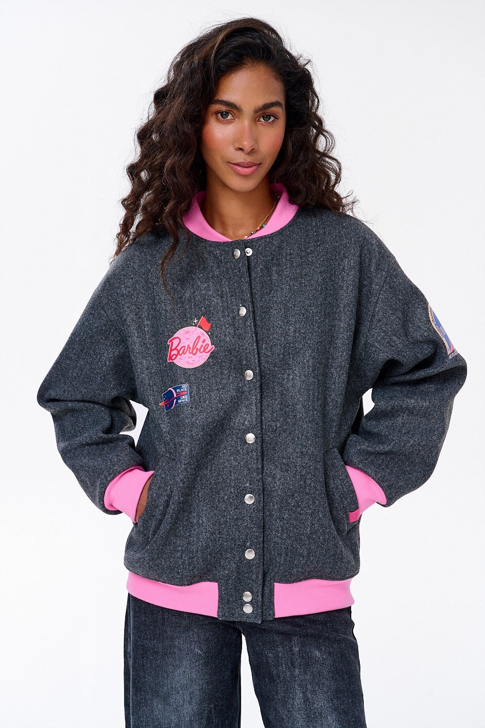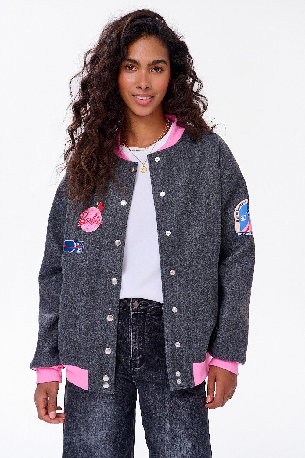 What sets it apart is its richness in detail. On front and sleeves, you'll find a collection of symbols inspired by space missions. back is adorned with a large, colorful print depicting Barbie™ astronaut gear.