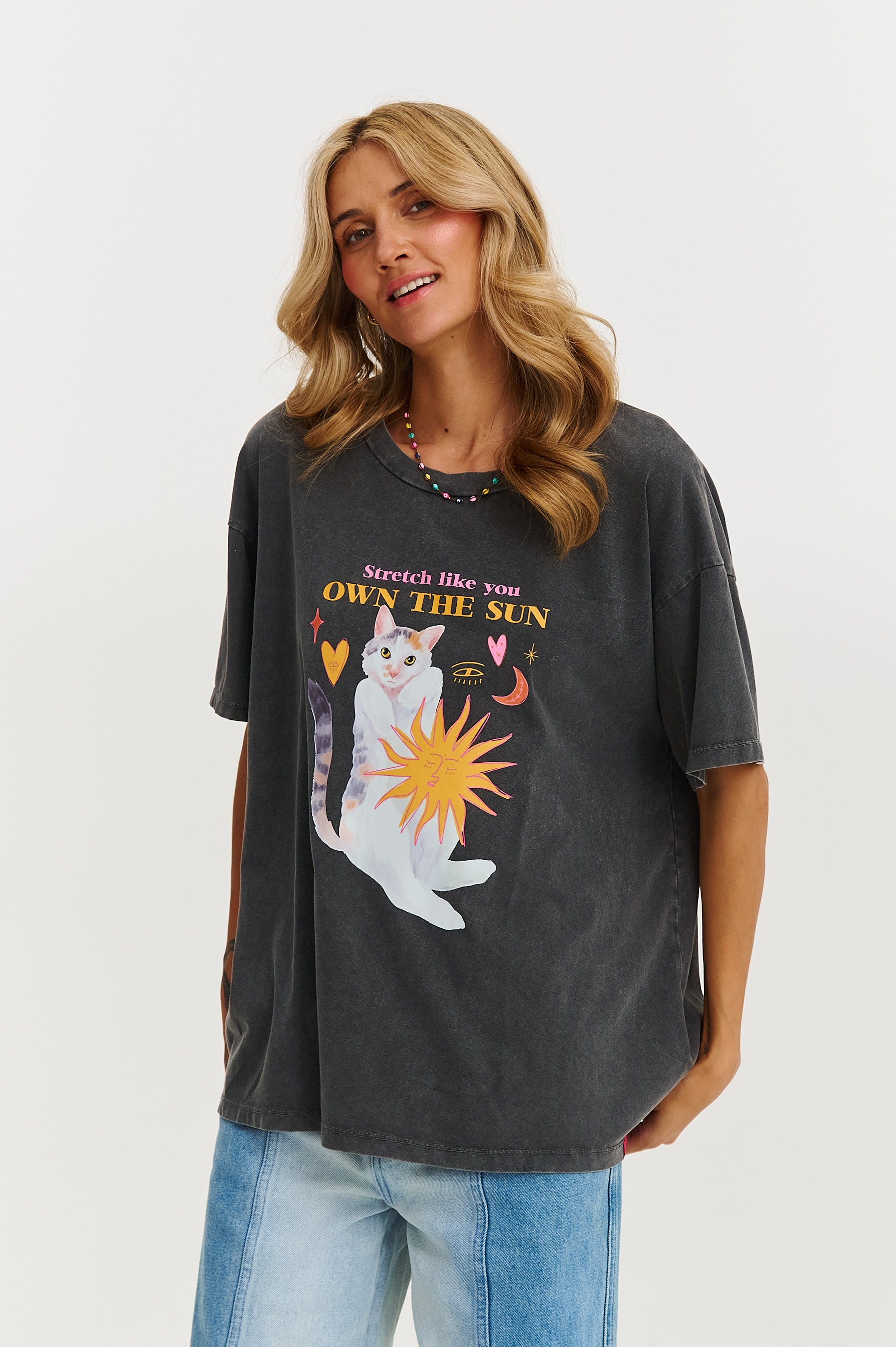 T-Shirt Own The Sun ist ein einzigartiges T-Shirt, das vom ersten Moment an alle Blicke auf sich zieht. Das Modell in ausgewaschenem Schwarz ist mit einer originellen Grafik einer Katze verziert, die von Sonne, Mond und magischen Symbolen begleitet wird. Dies ist ein Vorschlag für alle, die ihre Unabhängigkeit und ihre lebensfrohe Einstellung betonen möchten.