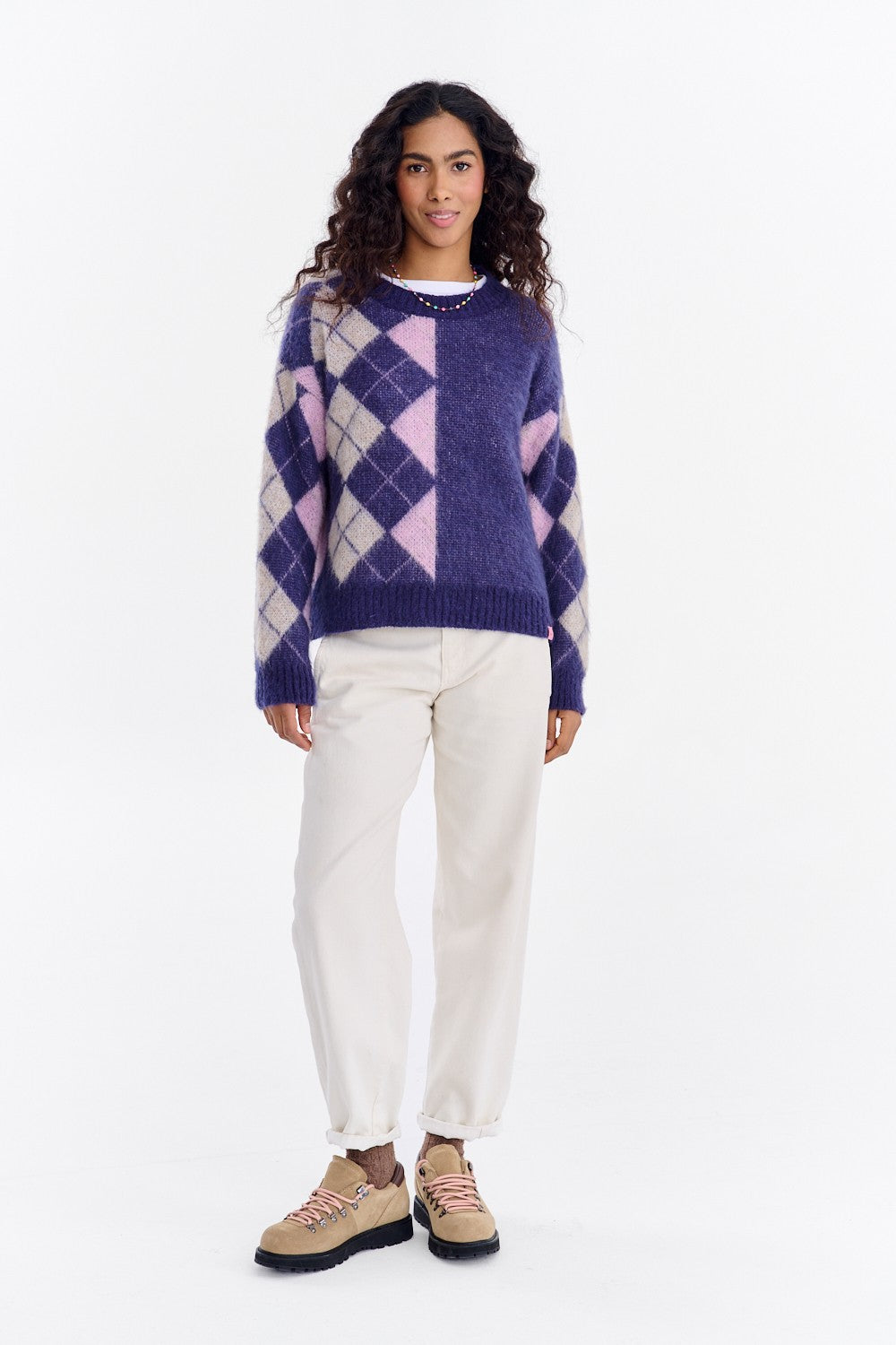 Der Quiet Story Mohair-Pullover ist ein Klassiker mit einem interessanten Twist. Er besticht durch eine gewagte Kombination kontrastierender Farben: Tiefes Lila, intensives Pink und klassisches Beige ergeben eine markante, geometrische Komposition.