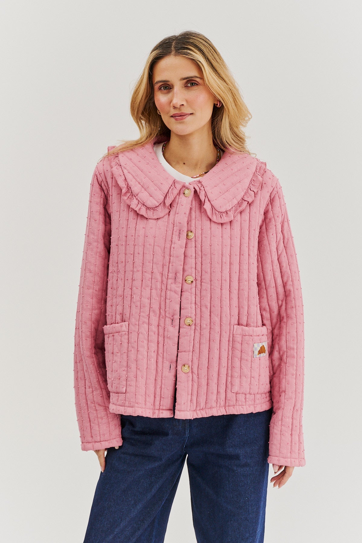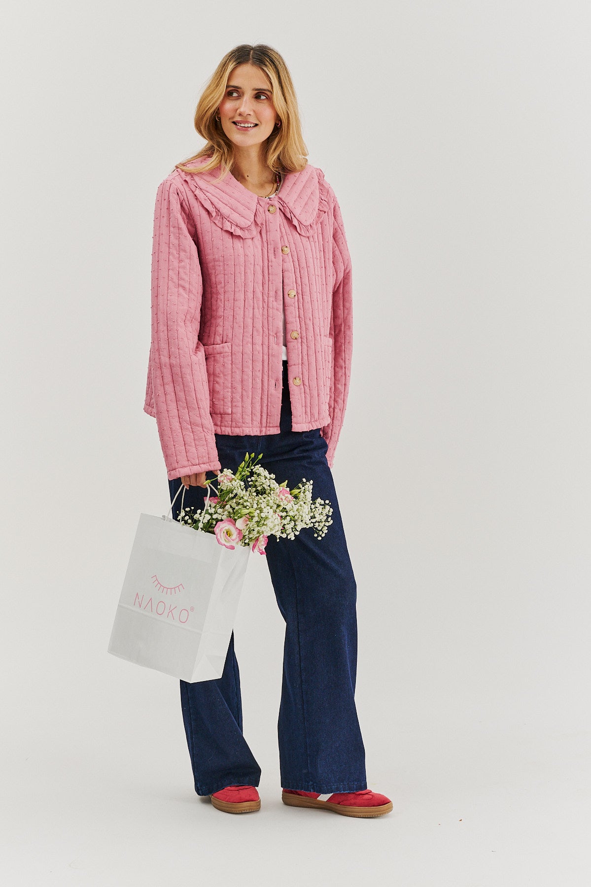 Rosy Blush leichte, gesteppte Jacke ist eine einzigartige Kombination aus romantischer Ästhetik und subtiler Eleganz. Der zarte Rosaton, die Struktur und der dekorative Kragen mit Rüsche verleihen ihr einen mädchenhaften Charme. Der lockere Schnitt sorgt für Komfort, während praktische Taschen Funktionalität hinzufügen.