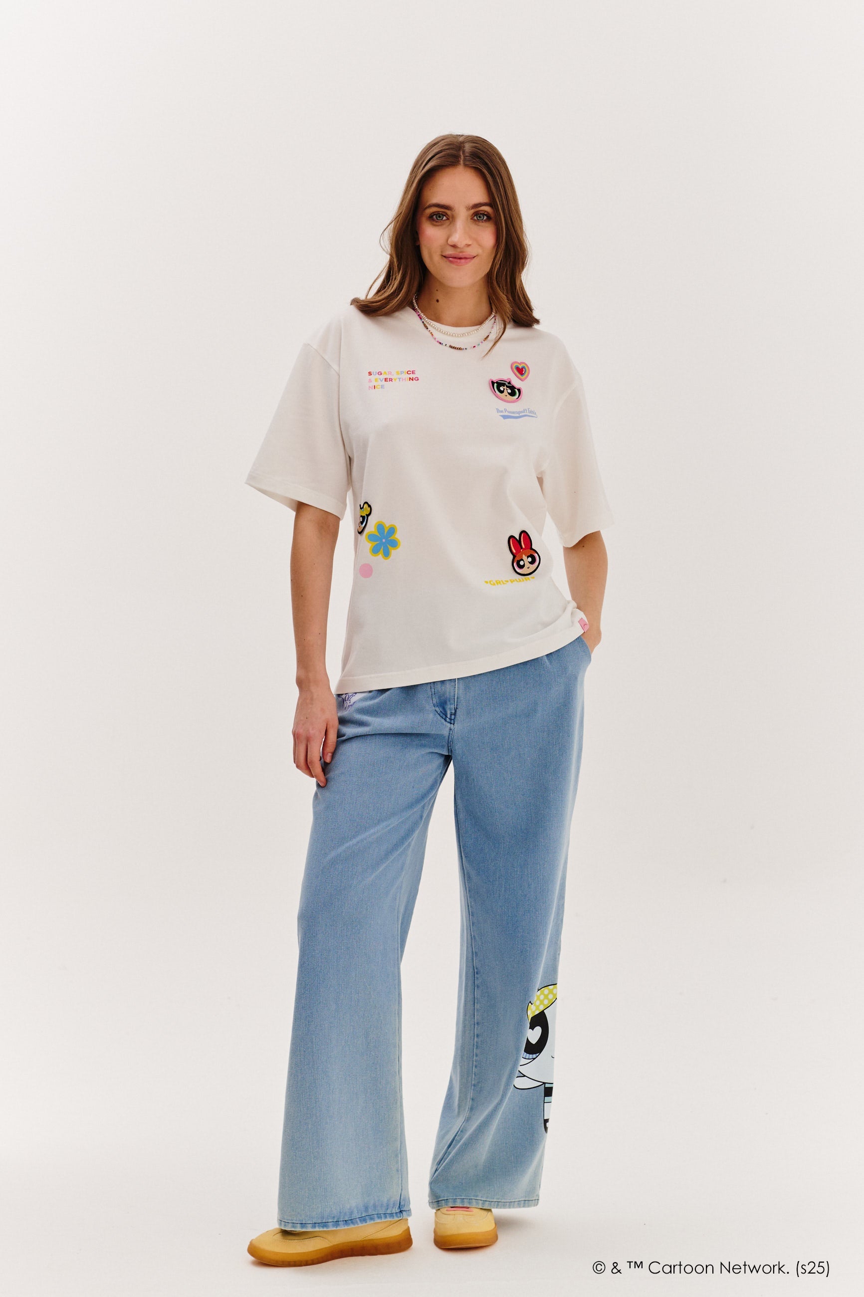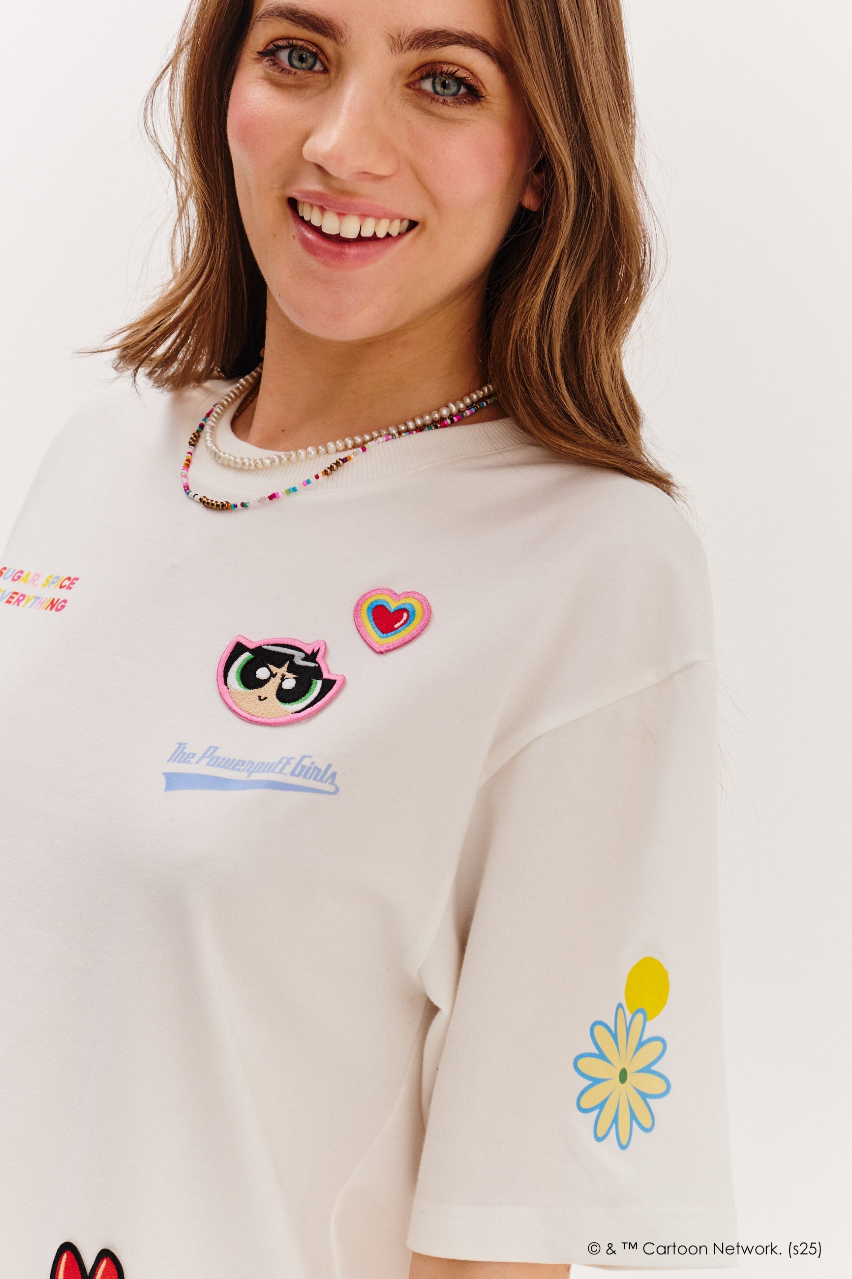Sugar & Spice T-Shirt ist eine Portion positiver Energie direkt aus Townsville! Der helle Hintergrund zeigt bunte Applikationen mit den Powerpuff Girls, Blumen und Slogans, die Stärke, Mut und Mädchenhaftigkeit feiern – mit Humor und Leichtigkeit.