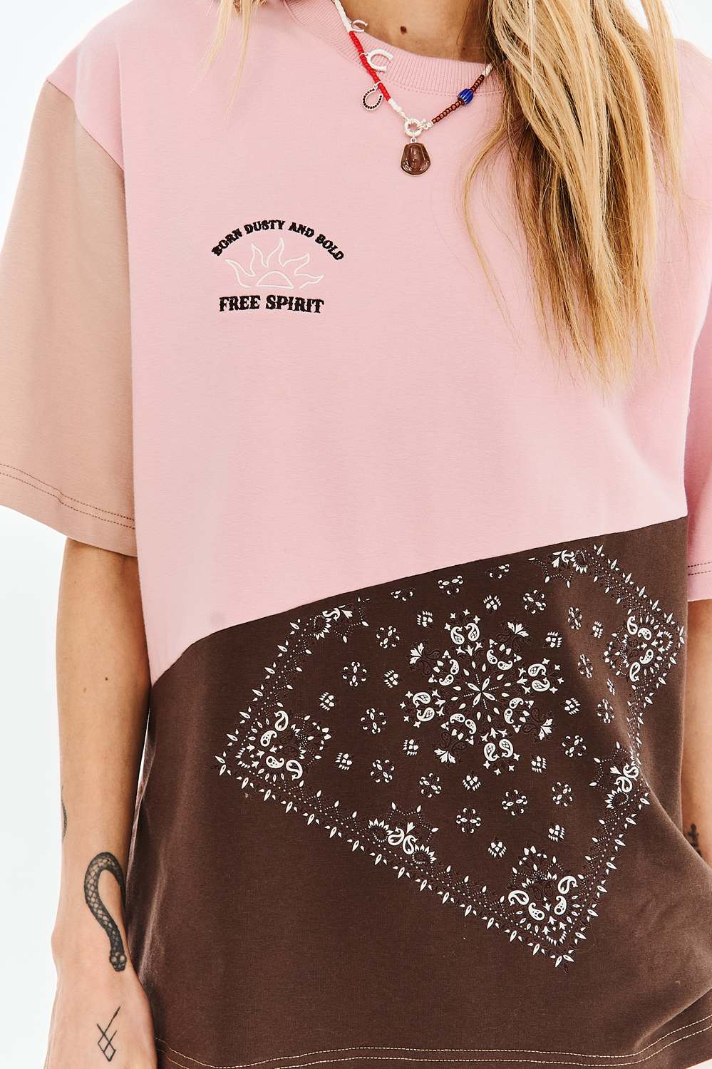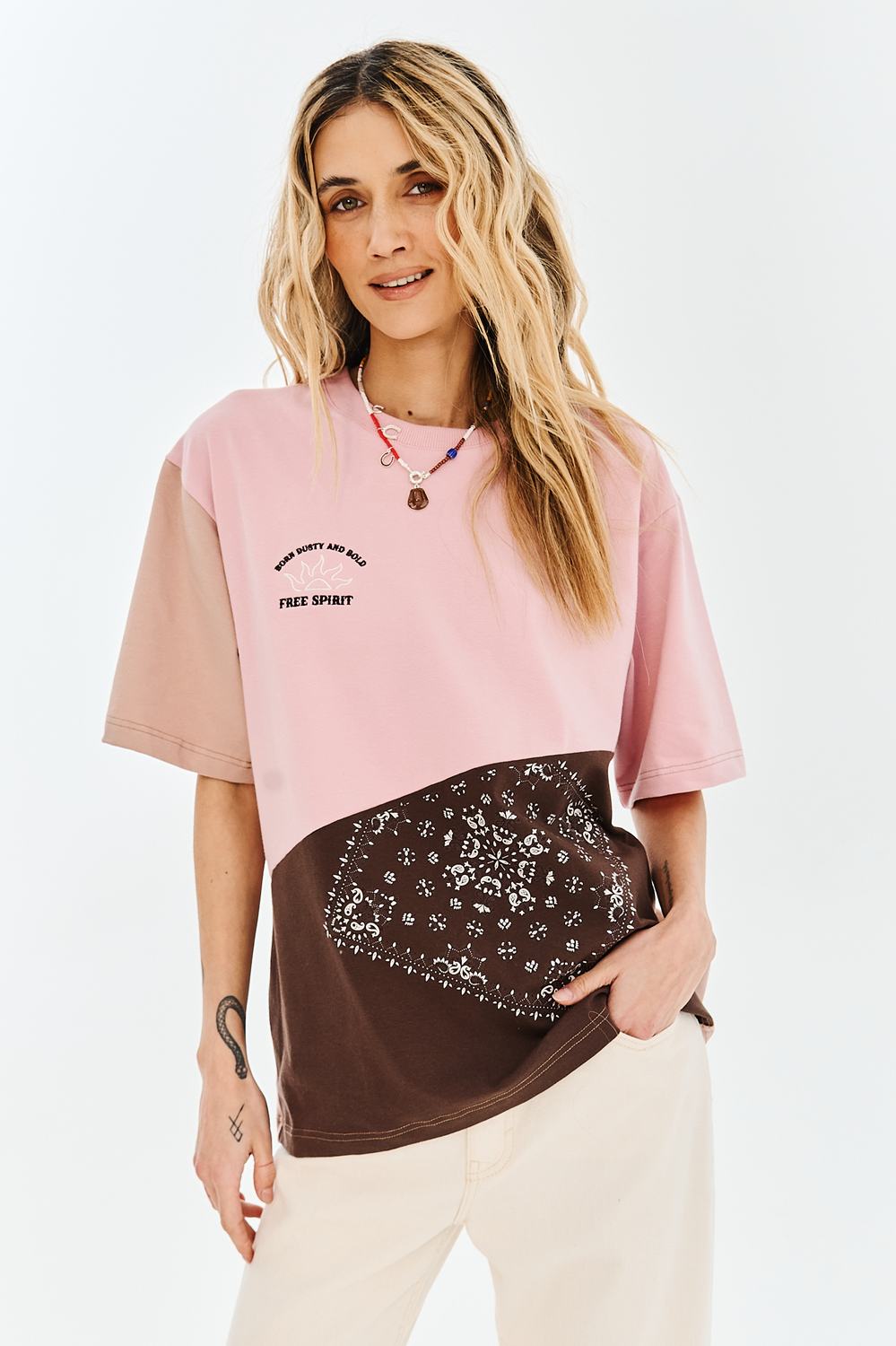 The Dusty Spirit T-shirt is a proposal for dreamers and free spirits. The unusual combination of dusty pink, deep brown, and a bandana print creates a unique whole. The embroidered "Free Spirit" inscription and subtle sun graphics give it an artistic expression.