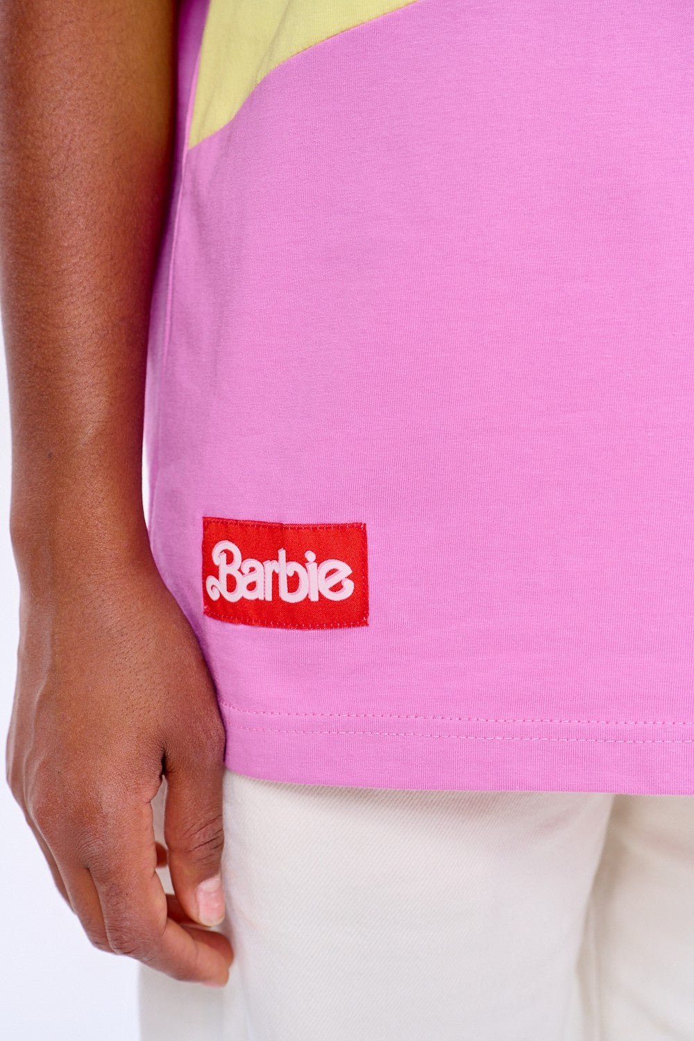 Carefully crafted details add to its charm: a print with Barbie™ logo on chest and a large, colorful retro-style inscription on back. Asymmetrical sleeves – one plain, or striped – emphasize its unique character. Wear it with denim shorts or loose pants.