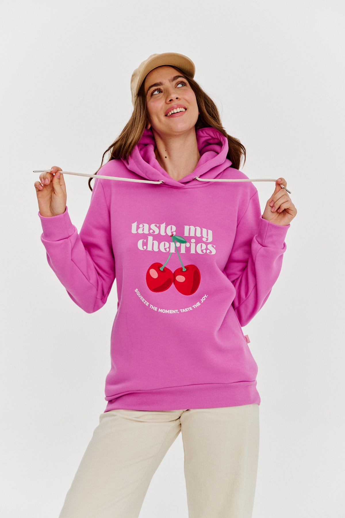 Taste My Cherries Hoodie – süß, sinnlich und voller positiver Energie! Saftiges Pink kombiniert mit auffälligen Schriftzügen und Grafiken roter Kirschen sorgt für einen markanten Look, der alle Blicke auf sich zieht. Der Slogan „Squeeze the moment, taste the joy“ erinnert uns daran, dass das Leben am besten schmeckt, wenn wir es in vollen Zügen genießen.