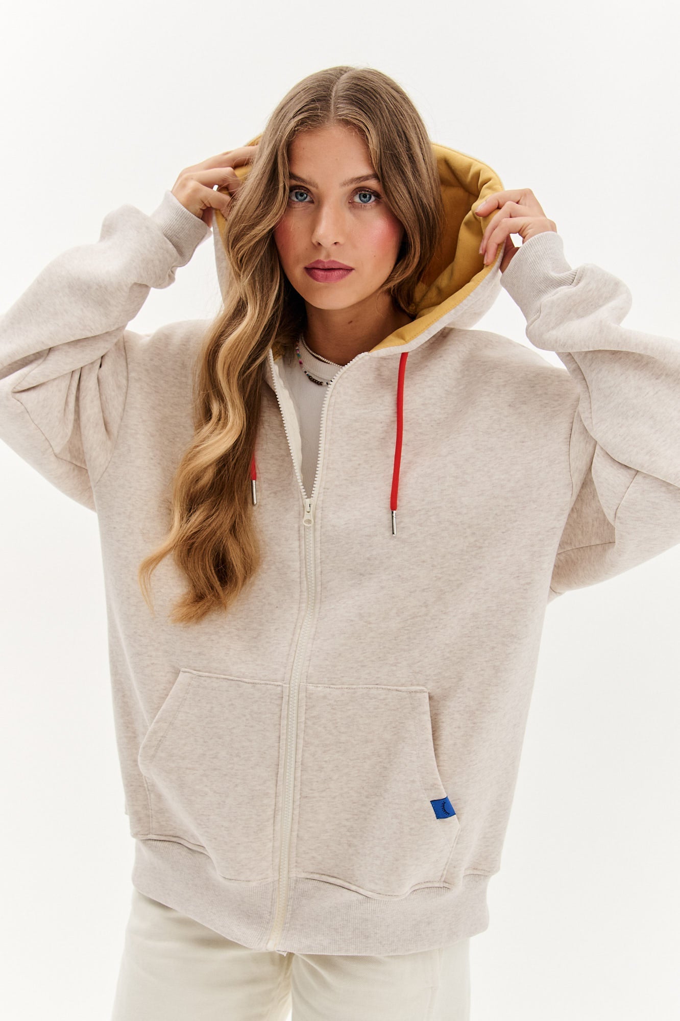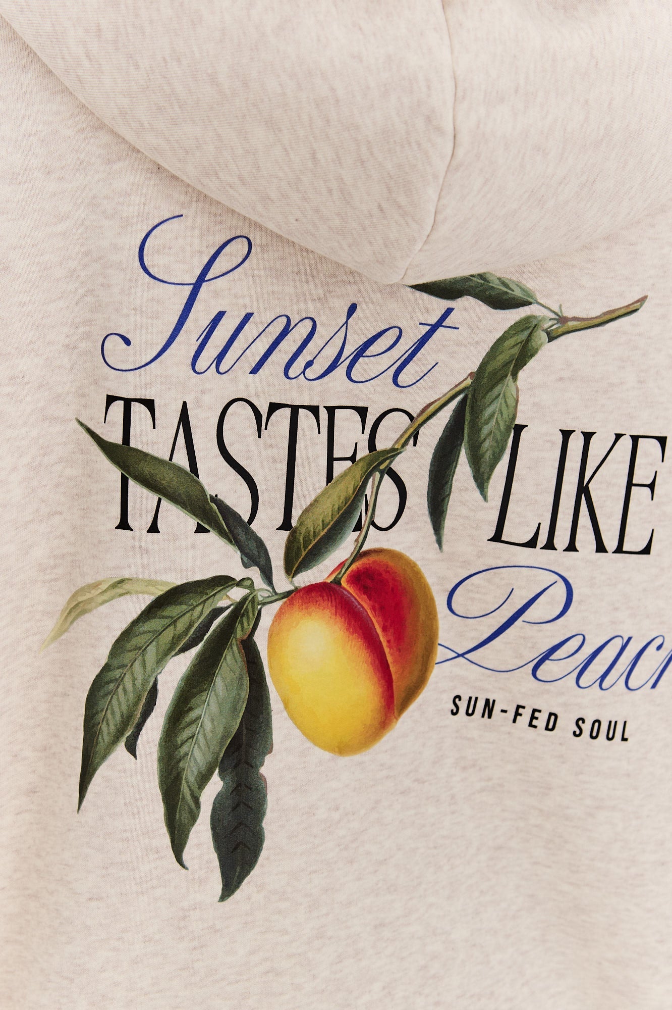 Taste Of Sunset offene Sweatshirtjacke ist ein lässiger Vorschlag mit einem Hauch von Poesie und Urlaubsstimmung. Das beigefarbene Farbschema wird durch einen Pfirsich-Print und den Slogan "Sunset tastes like peach" aufgelockert, der an Sommerabende und süße Faulheit erinnert. Das Modell verfügt über eine bequeme Kapuze, weiche Kordeln und geräumige Taschen – ein Klassiker im NAOKO-Stil, aber mit künstlerischem Touch.