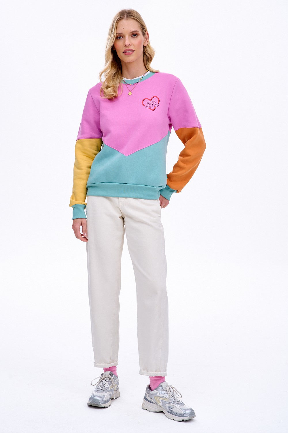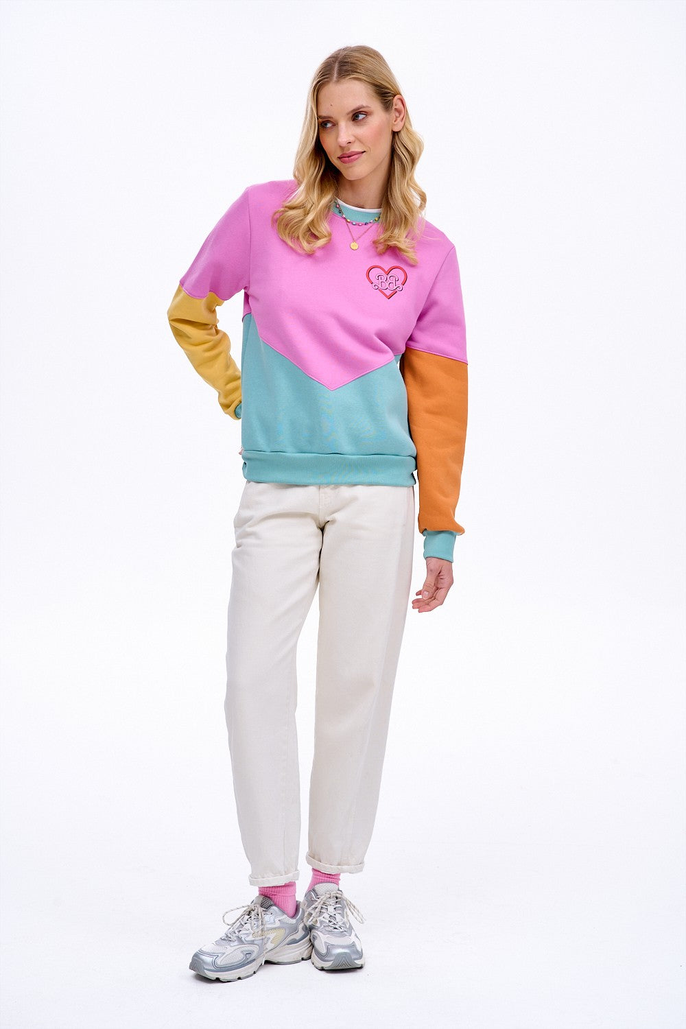 Boombox sweatshirt is epitome of '80s style. Its design is based on a geometric combination of pastel panels – a pink top, a mint bottom, and asymmetrical sleeves in shades of yellow and orange. It's perfect way to liven up any outfit.