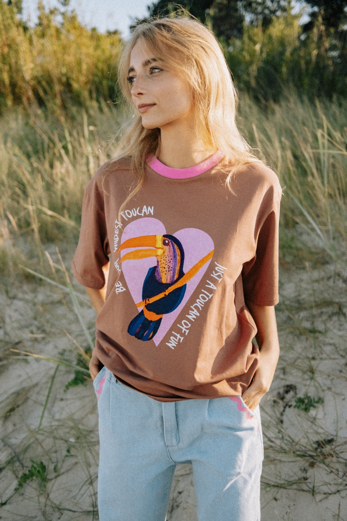Der warme Kakaoton des T-Shirts steht im Kontrast zum pinken Herz und den Details und sorgt so für einen originellen und auffälligen Look. Das Toucan Do It T-Shirt ist die perfekte Wahl für lässige Urlaubsoutfits – trage es zu Leinen-Shorts, einem Maxirock oder High-Waist-Jeans.
