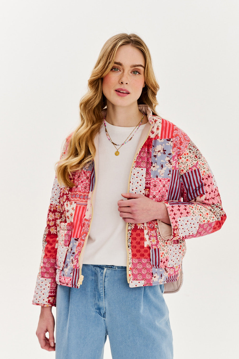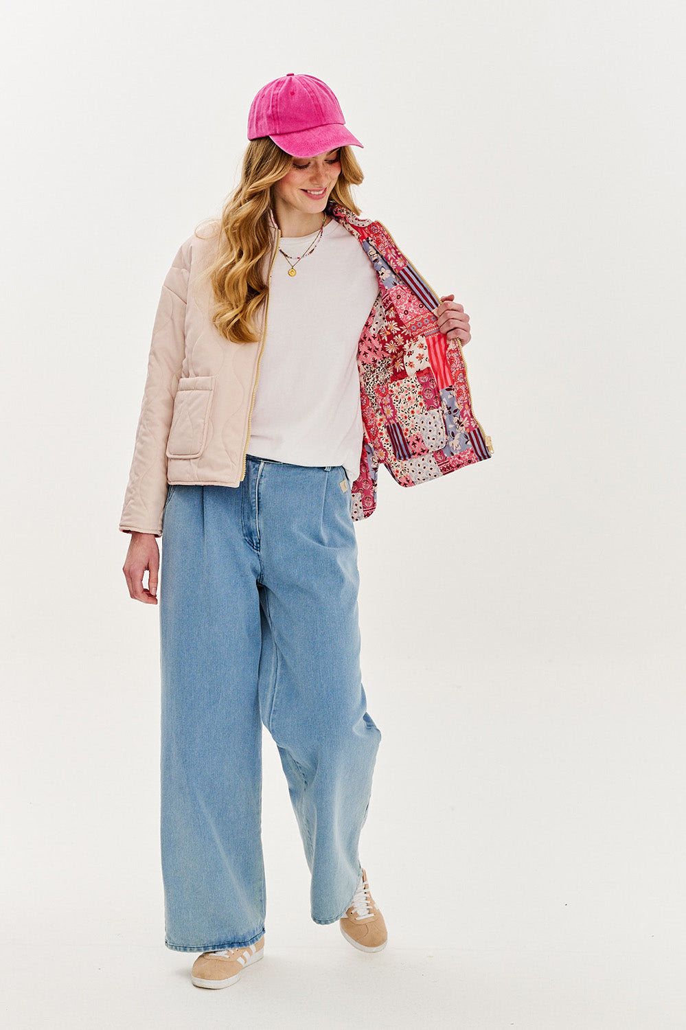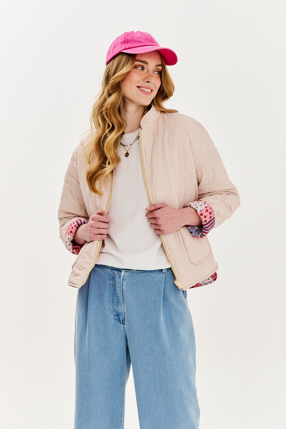 Die leichte, gesteppte Jacke Vintage Harmony vereint Komfort und Stil in einer dezenten, zeitlosen Farbgebung. Ihr einzigartiges Design kombiniert zeitloses Beige mit Pastelltönen und zartem Rosa zu einem besonderen Effekt. Der Oversize-Schnitt und die Steppnähte verleihen ihr einen modisch-lässigen Charakter, während kontrastierende Paspeln und funktionale Taschen ihren einzigartigen Stil unterstreichen.