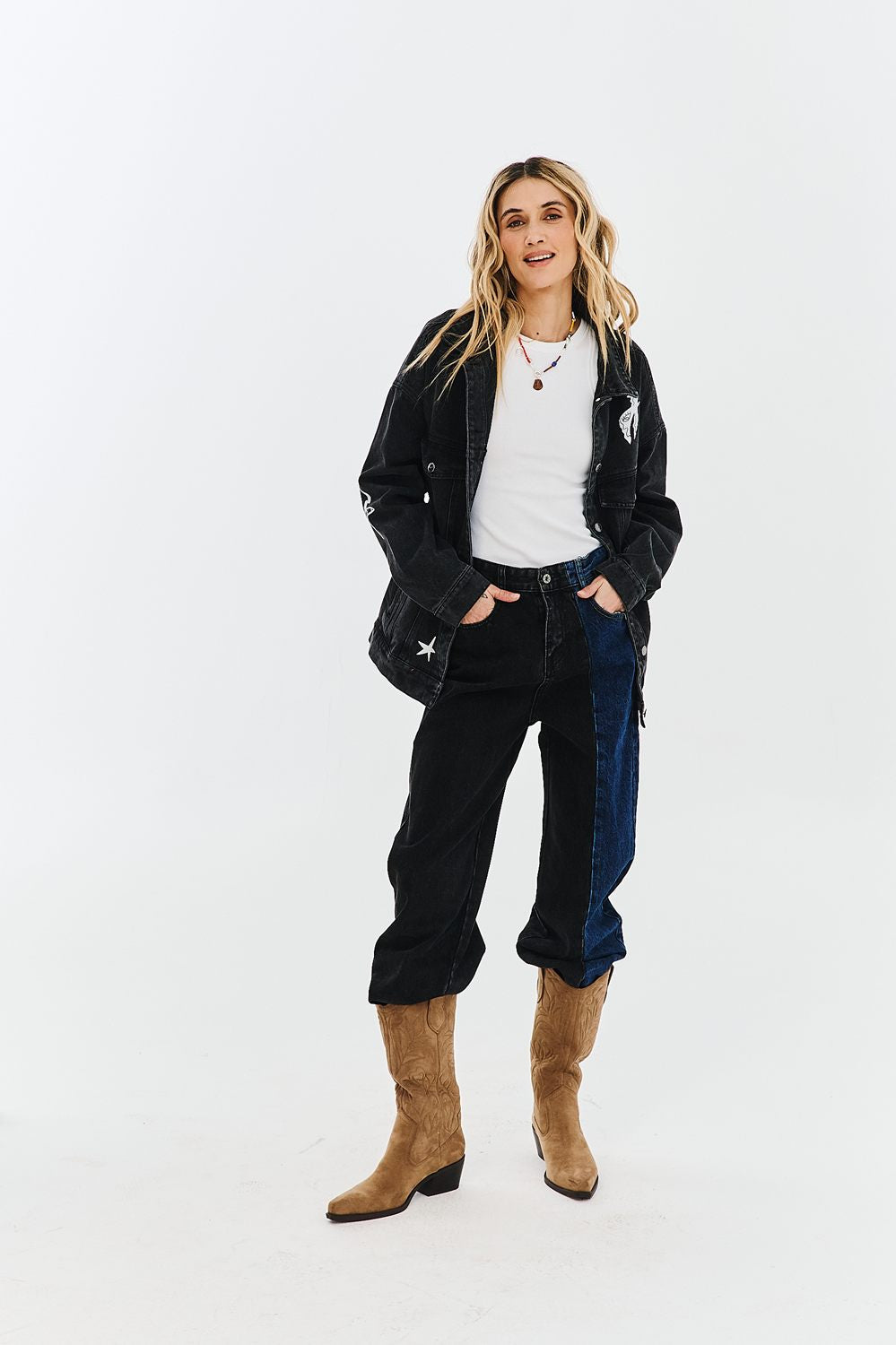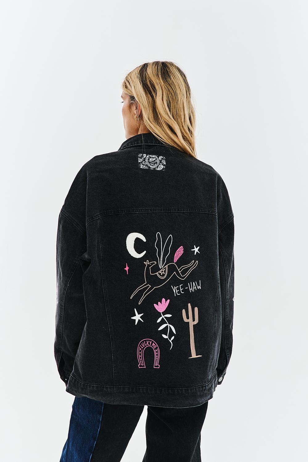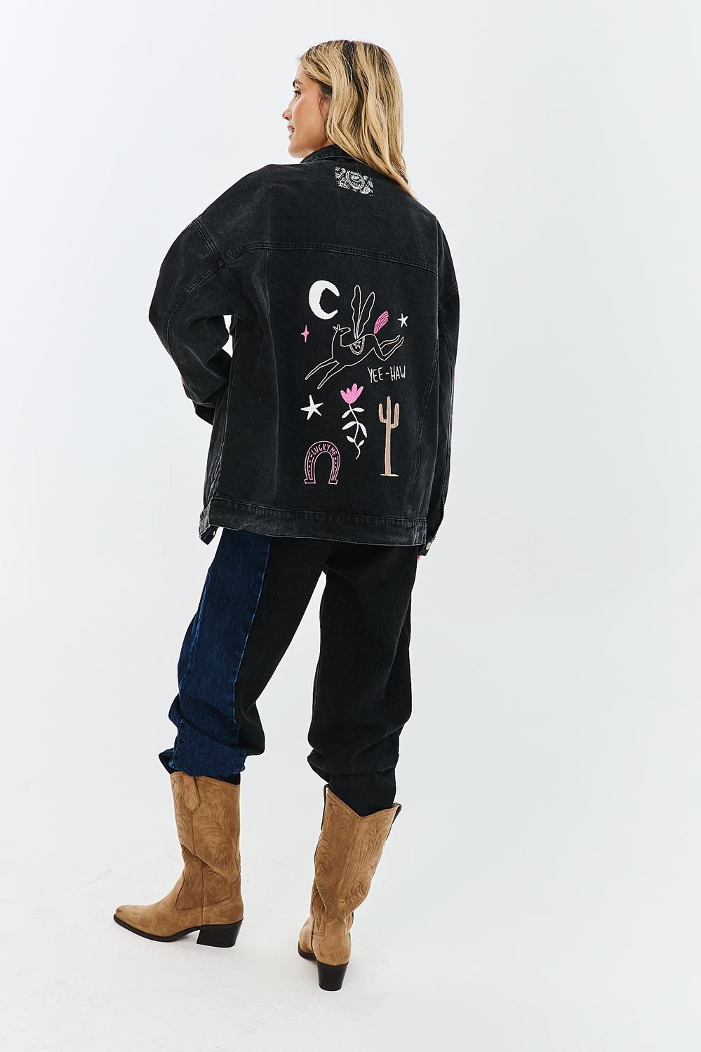 This is no ordinary jacket. The Yeehaw Dreams is eye-catching with its details: from the white stars and lightning bolts on the sleeves to the elaborate, colorful composition on the back featuring a moon, cactus, and the word "YEE-HAW." The jacket features practical chest pockets and metal buttons. It's perfect paired with patchwork jeans for a bold, total look, or as a wrap over a flowing boho dress.
