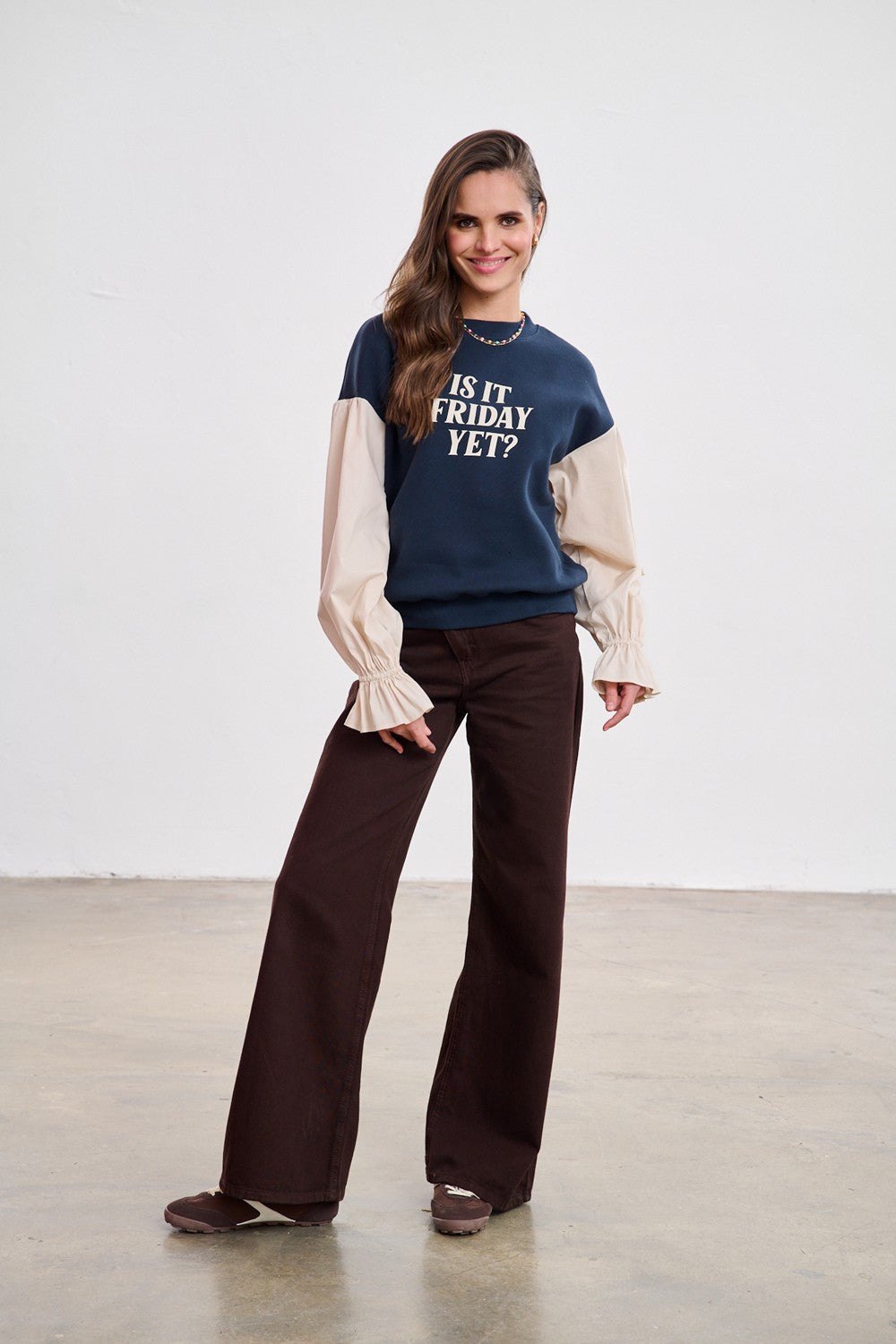 The Friday Mood sweatshirt combines elegance and casual style. The dark navy front slims the figure, while the contrasting, wide cream sleeves with decorative cuffs add a romantic touch. The question "Is it Friday yet?" isn't just a print, it's the mindset of every working girl.