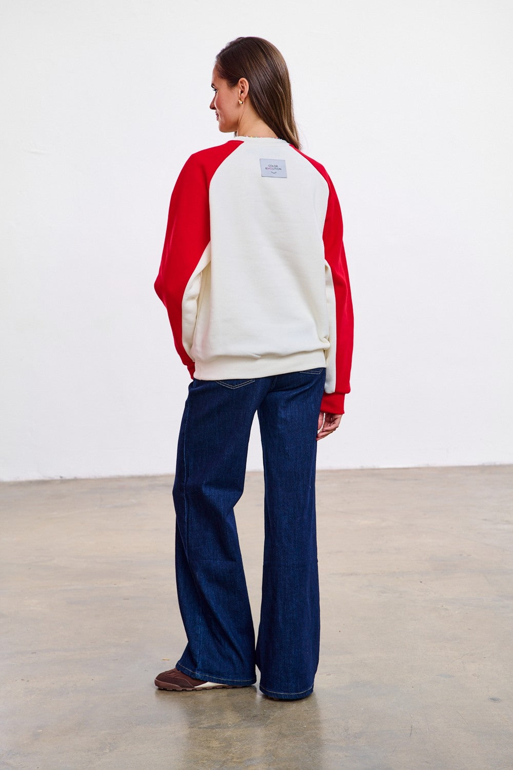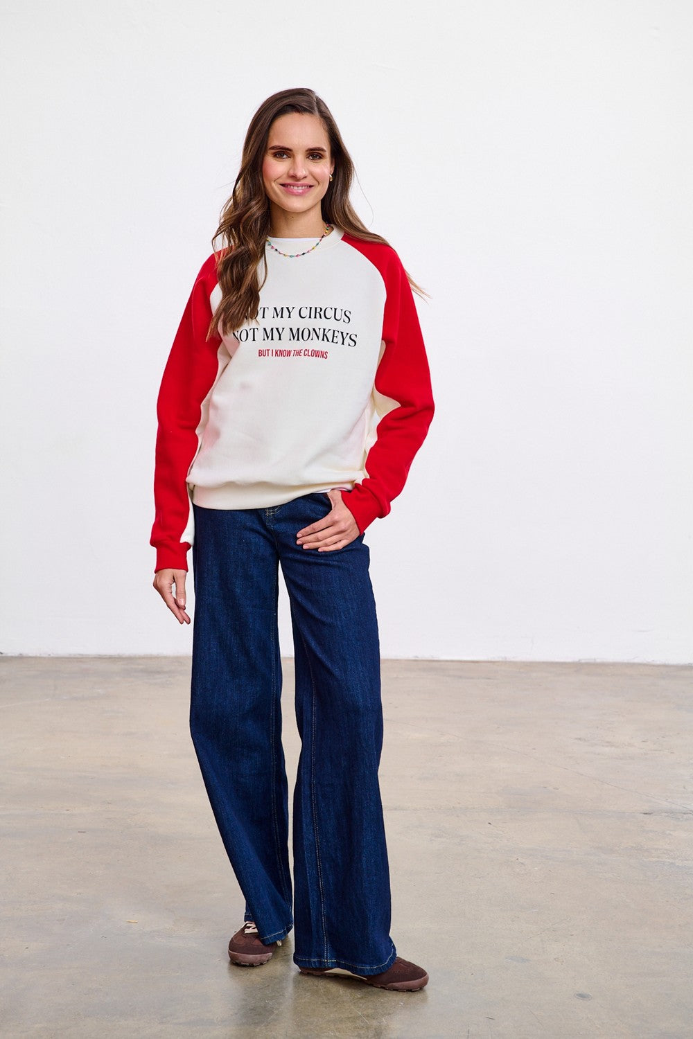 The Not My Circus sweatshirt is a nod to classic baseball caps. The white body is paired with vibrant red sleeves, giving the silhouette a light feel. The focal point is an ironic inscription that perfectly sums up many life situations. Matching cuffs complete the look.