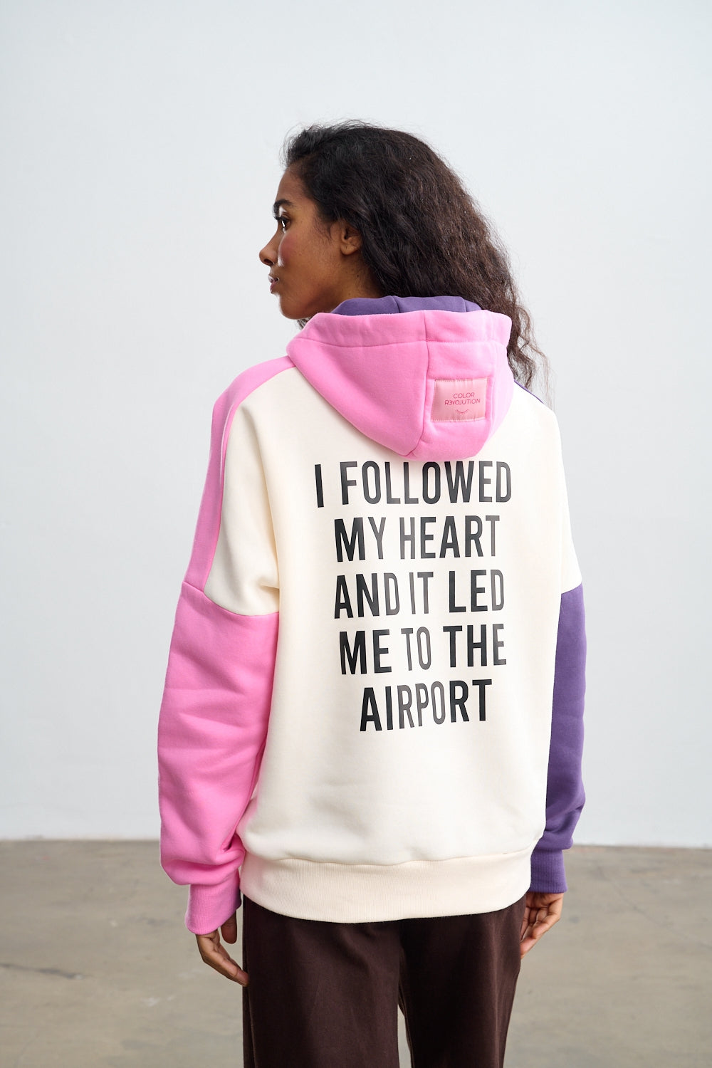 The Terminal One sweatshirt was created with travelers in mind. The beige body perfectly complements the colorful sleeves in shades of pink and purple. The slogan on the back: "I followed my heart and it led me to the airport" is the motto of every fan of exploring the world. The practical kangaroo pocket holds your ticket and phone.
