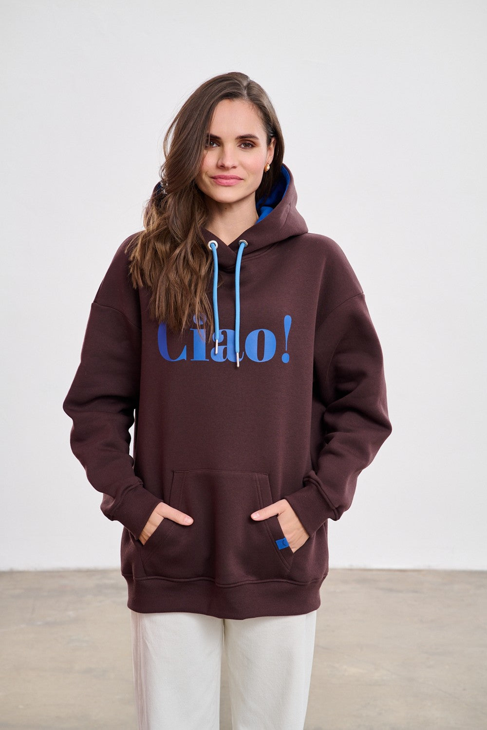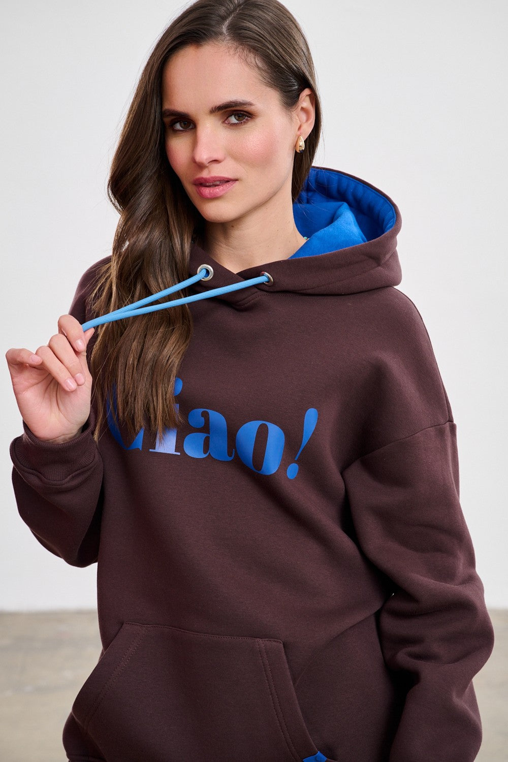 The Ciao Bella hoodie is a masterful combination of deep brown and vibrant blue, which adorns the inside of the hood and drawstrings. The front greets the world with the slogan "Ciao!", while the back bids farewell with the eloquent "Arrivederci!". The loose tunic cut makes the hoodie incredibly comfortable and stylish.