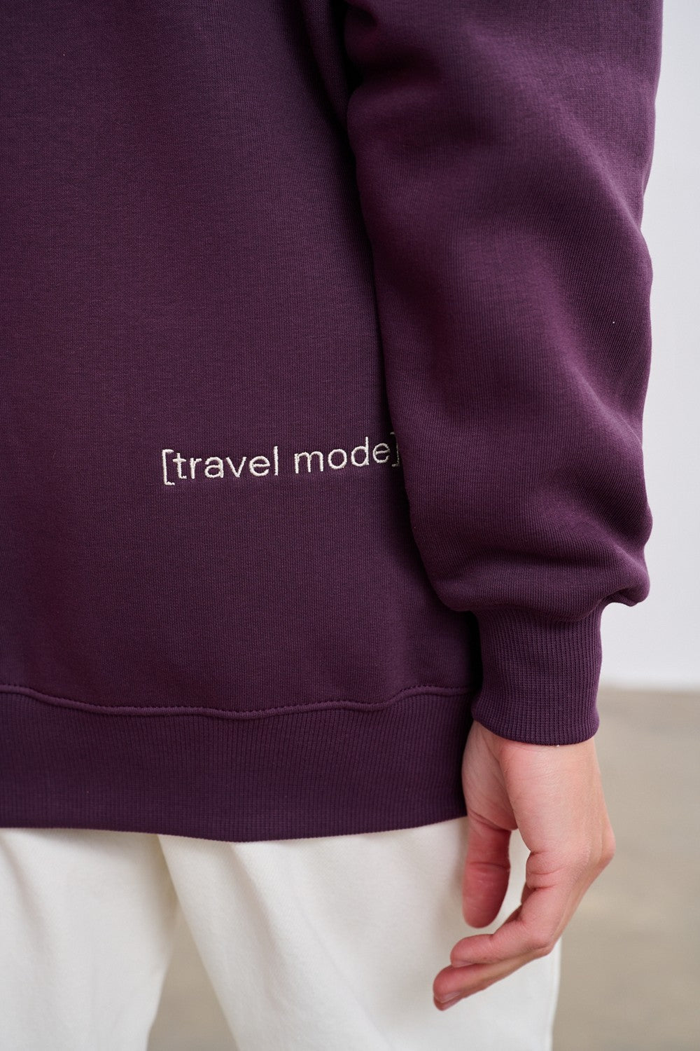The Off We Go hoodie in a deep plum color is the definition of comfort on the go. The zippered design allows for quick temperature regulation, and spacious pockets store small items. Minimalist "off we go" inscriptions on the chest and "[travel mode]" on the back emphasize its purpose.