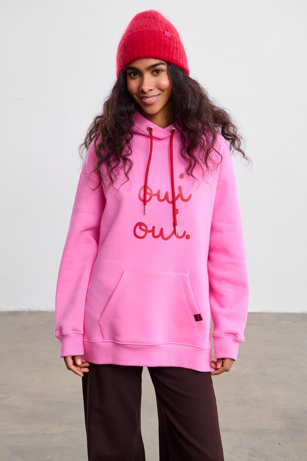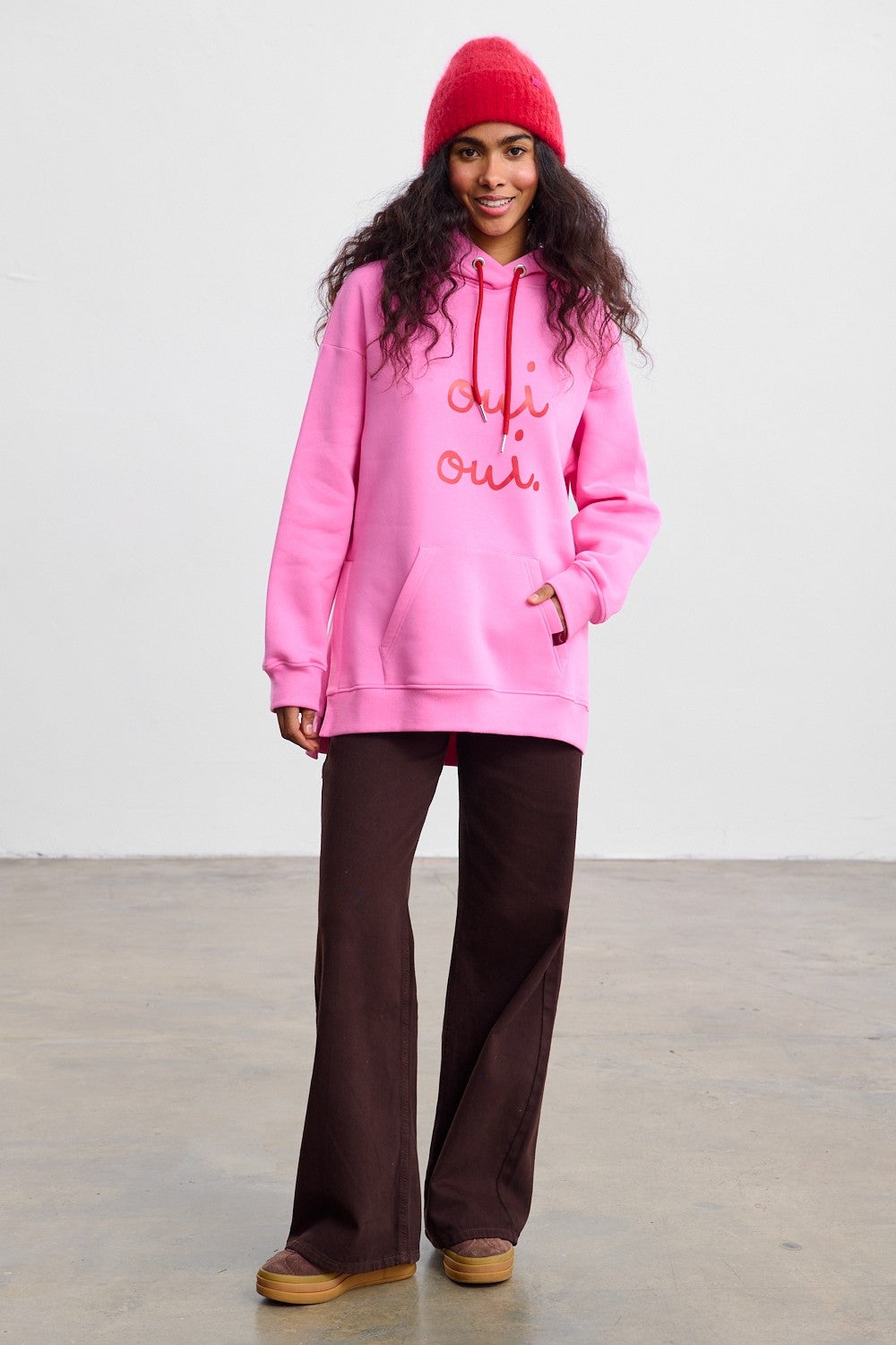 The Oui Oui hoodie is a nod to French casual style with a girly twist. Pastel pink is offset by vibrant black in the form of a handwritten inscription on the chest and hem. The extended tunic cut and oversized hood with contrasting drawstrings make it the perfect choice for cooler days.