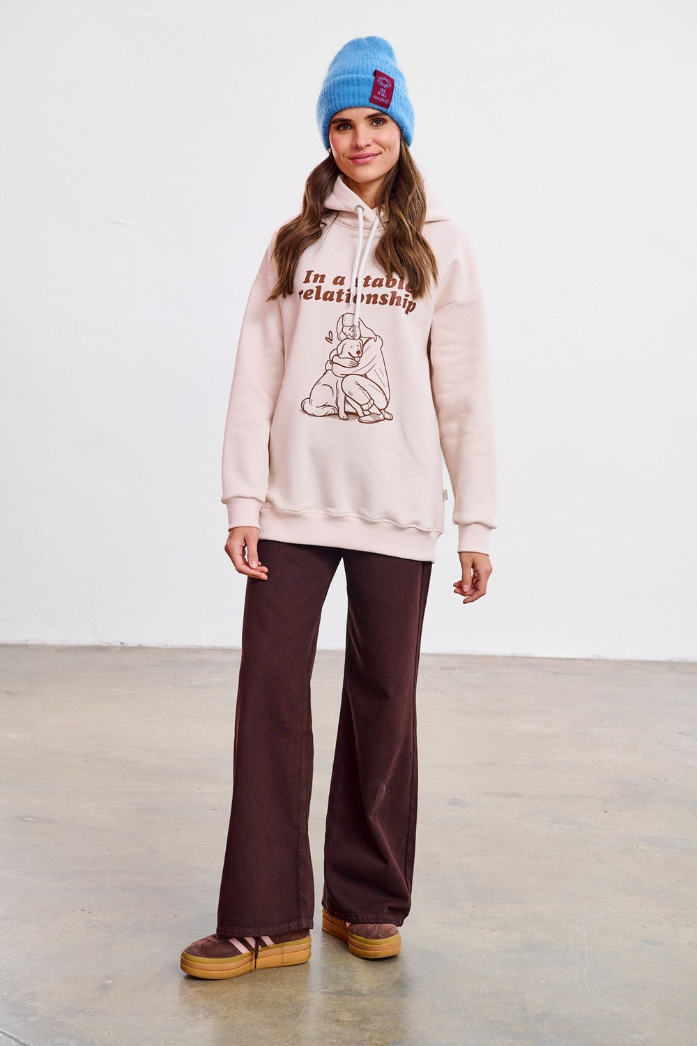 The Stable Relationship Hoodie is more than just clothing – it's a declaration of love for your pet. A charming graphic of a girl cuddling a dog and a message that says it all: "In a stable relationship" appear against a light, cream background. The long cut and oversized hood ensure maximum comfort.