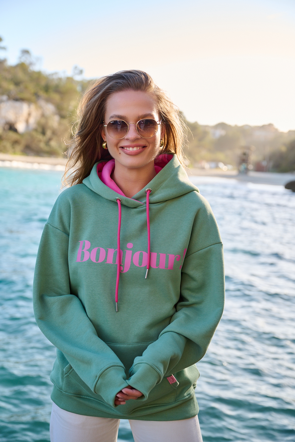 Bonjour Chérie hoodie is quintessential Parisian chic in a casual way. Made of soft and tactile fabric, it ensures comfortable all-day wear. The stylish Bonjour! inscription on the front stands out, while the Adieu! inscription on the back gives the sweatshirt a unique character and a slightly nonchalant vibe. The contrasting interior of the hood in intense pink adds to its distinctiveness, while details such as pink strings and delicate embroidery on the label emphasize its uniqueness.