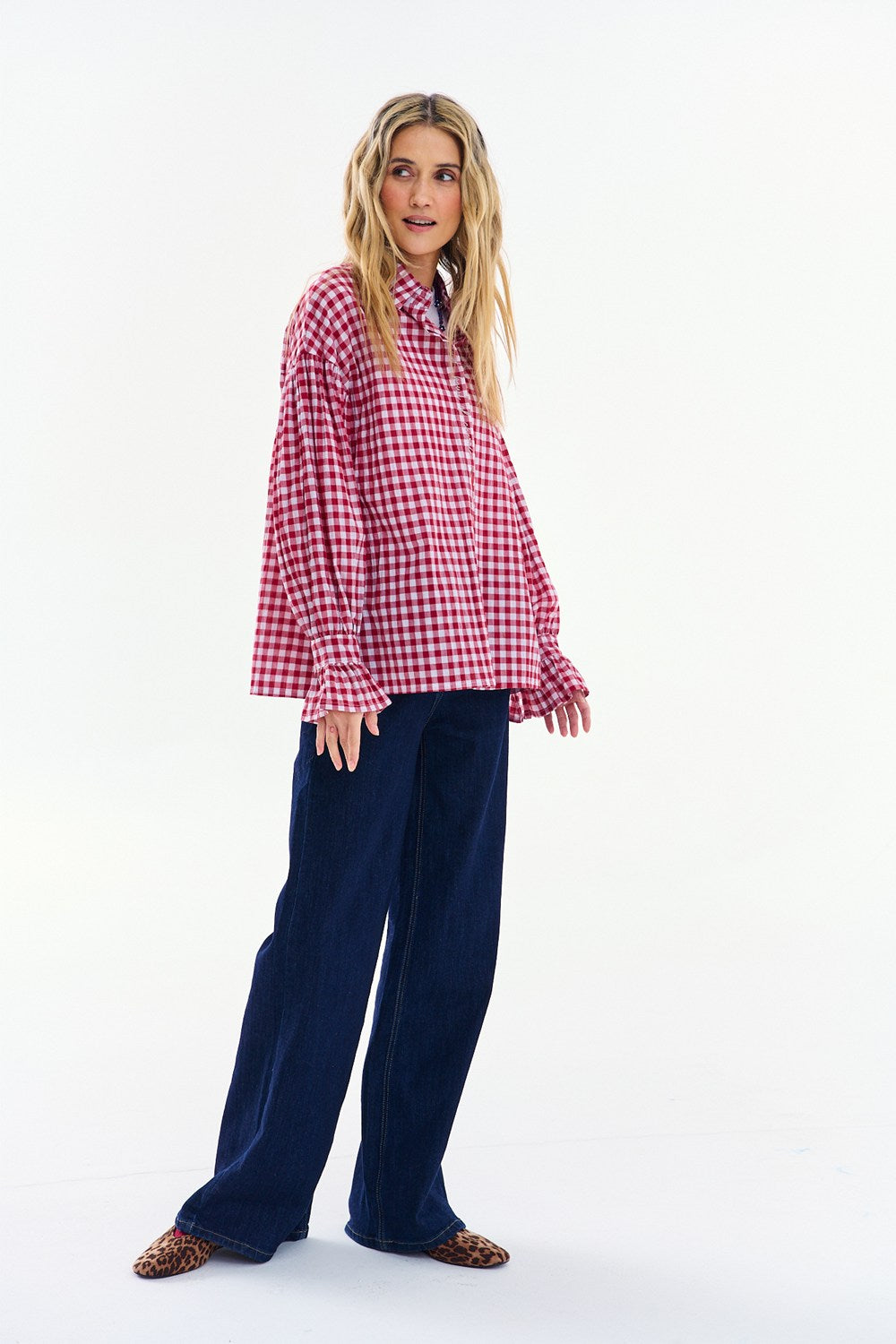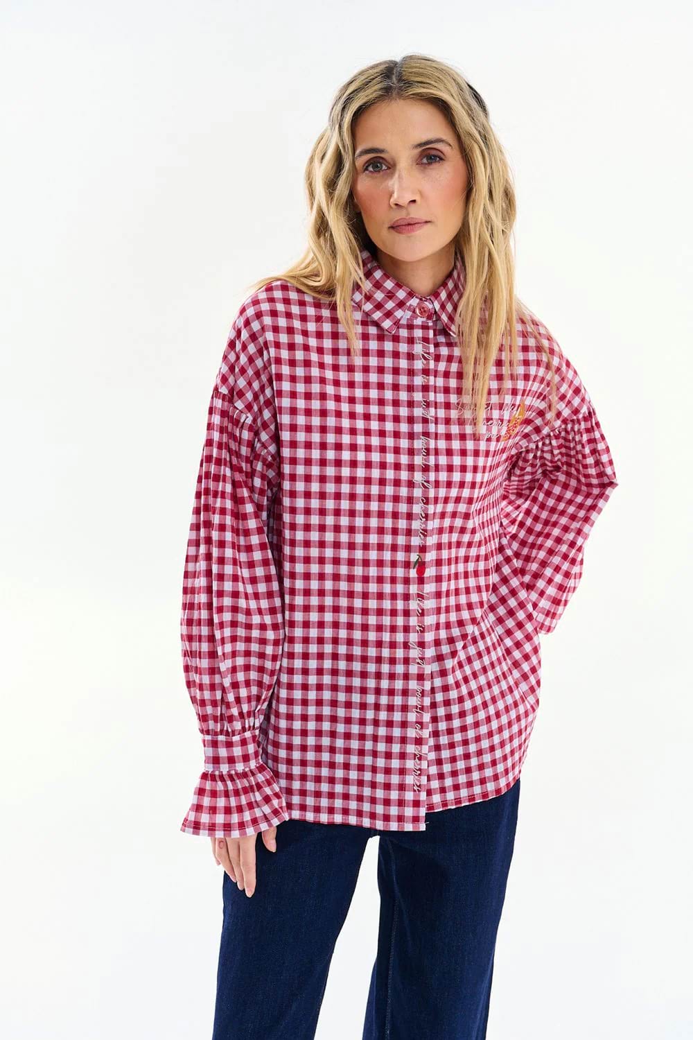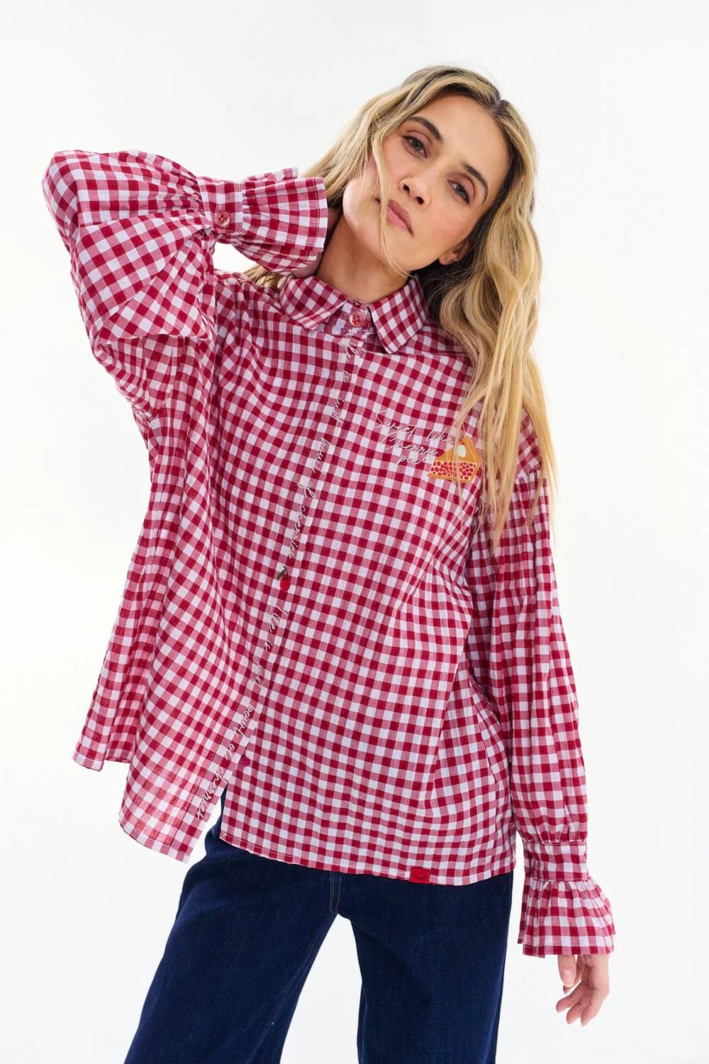 The Cherry Pie Shirt catches the eye with its classic red and white checkered pattern. Embroidered motifs give it a unique, nostalgic charm.