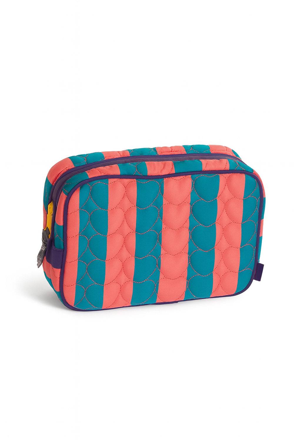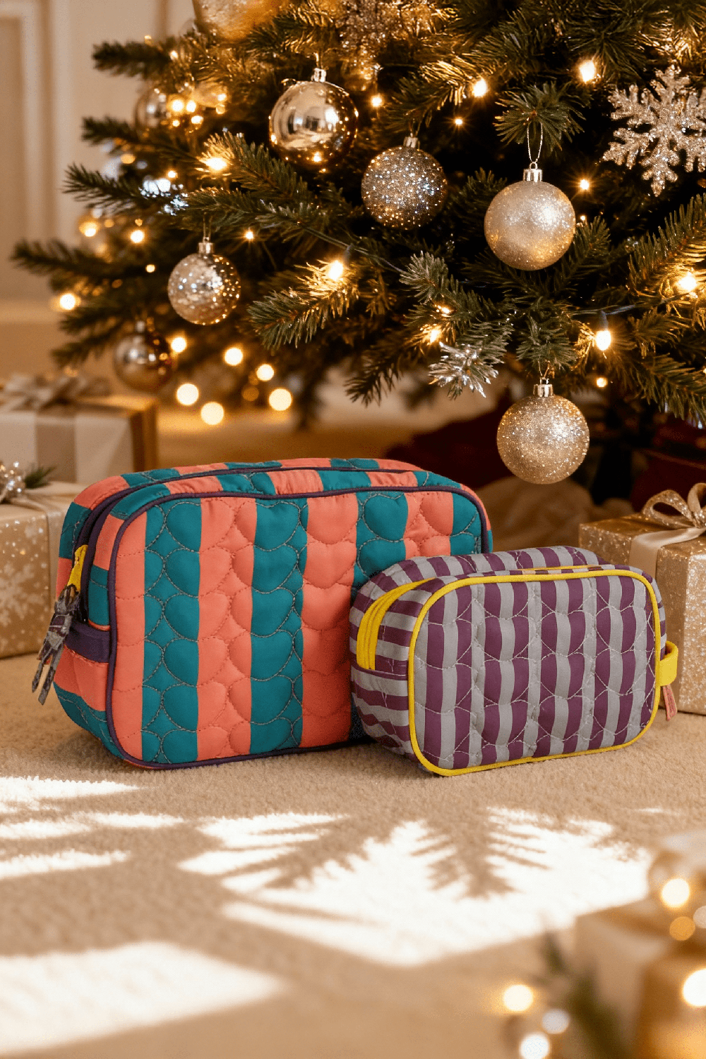 Color Therapy Cosmetic Bag Set combines functionality with a cheerful design. The quilted texture with geometric patterns in shades of green, purple, and orange is eye-catching. Sturdy zippers and durable material ensure these cosmetic bags will last a long time.