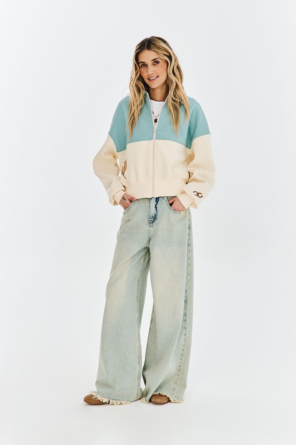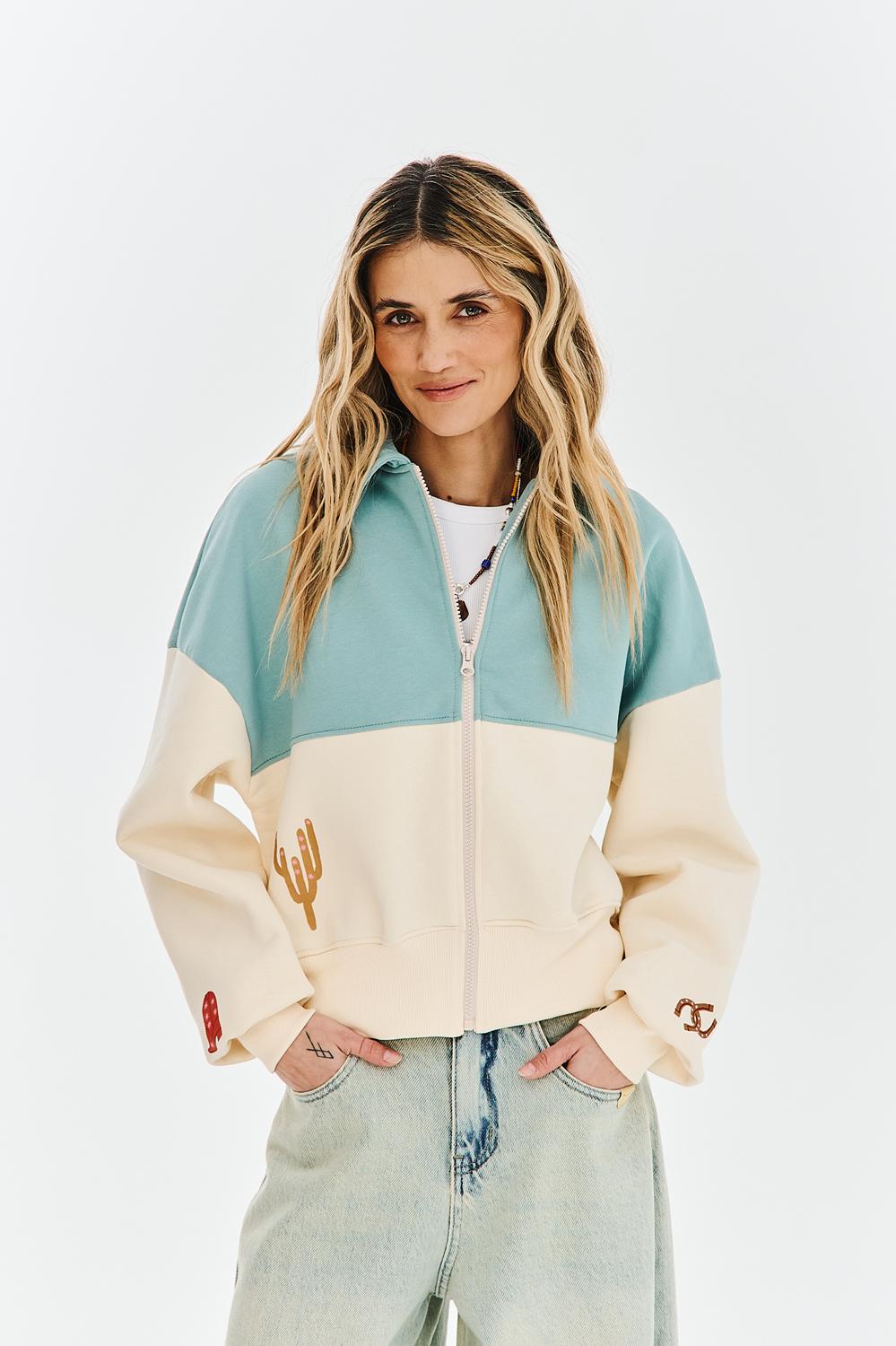 The Cowgirl Club zip-up sweatshirt is a design full of detail. The two-tone construction with a collar and zipper is reminiscent of retro baseball jackets. Embroidered cacti, a cowboy boot, and a slogan on the back create a cohesive, joyful whole.