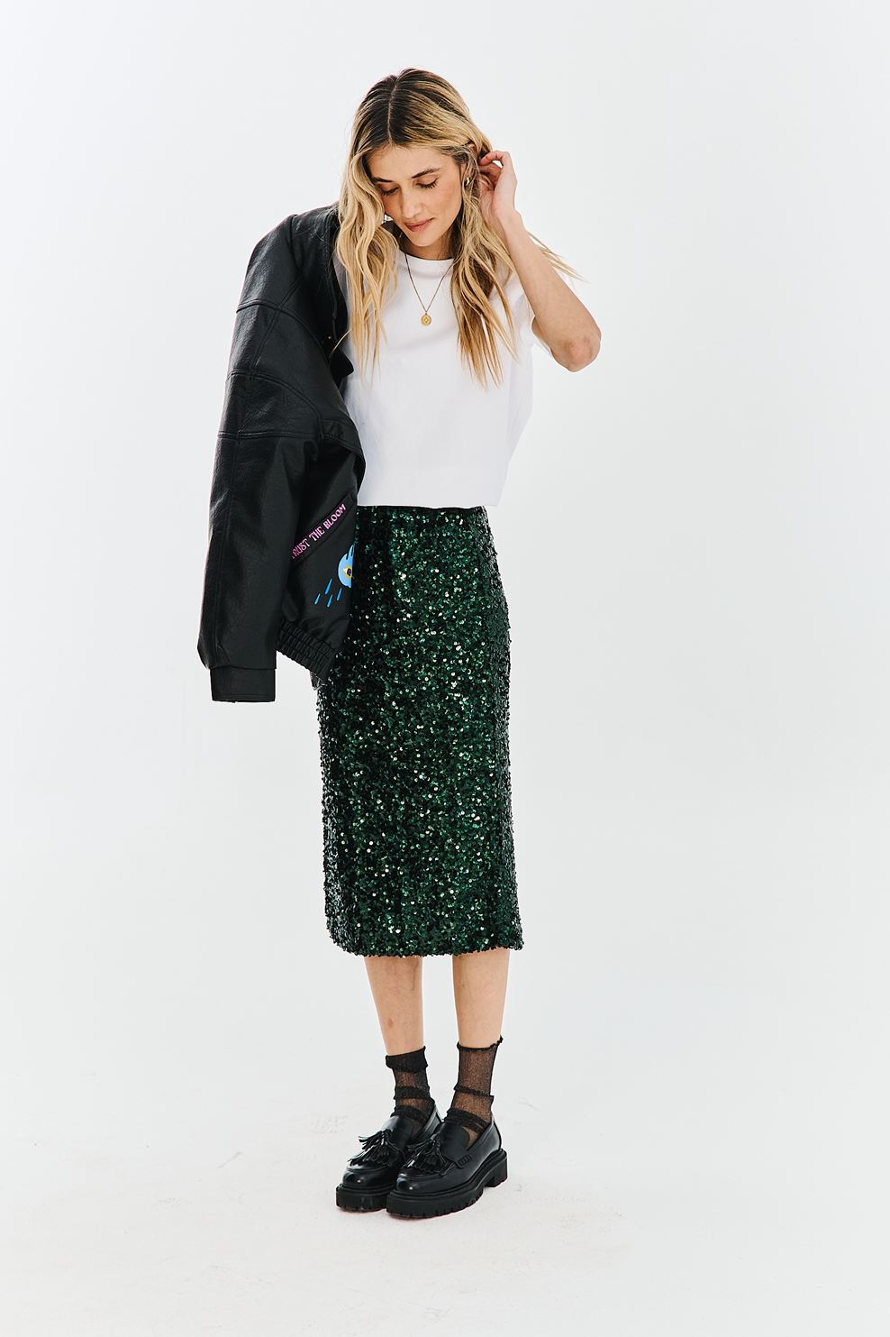 Emerald Glam sequin skirt is an elegant choice for women who want to shine during special occasions. The deep emerald hue and shimmering sequins add a luxurious touch to the styling. The pencil cut emphasizes the silhouette, and the elastic waistband - an elastic waistband - provides comfort and a perfect fit