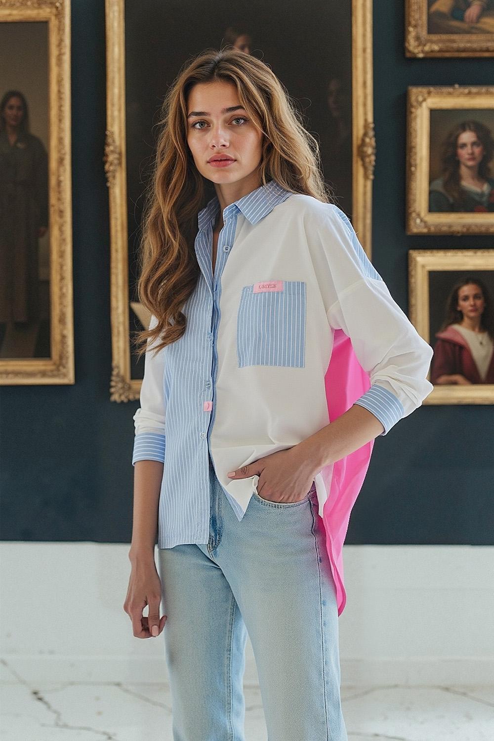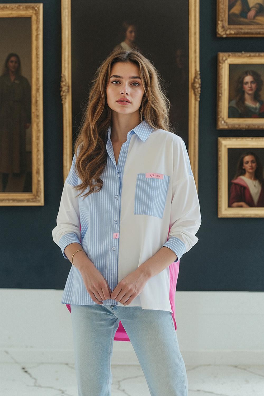 Dare to mix classics with a touch of fantasy - Fresh Attitude's blended fabric shirt is an oversize design that proves that contrasts can create a cohesive whole. In the front - a play of stripes and pure white, in the back - a surprising dose of sweet pink.