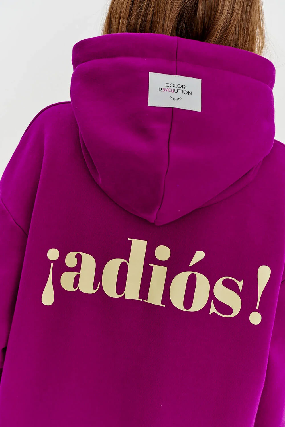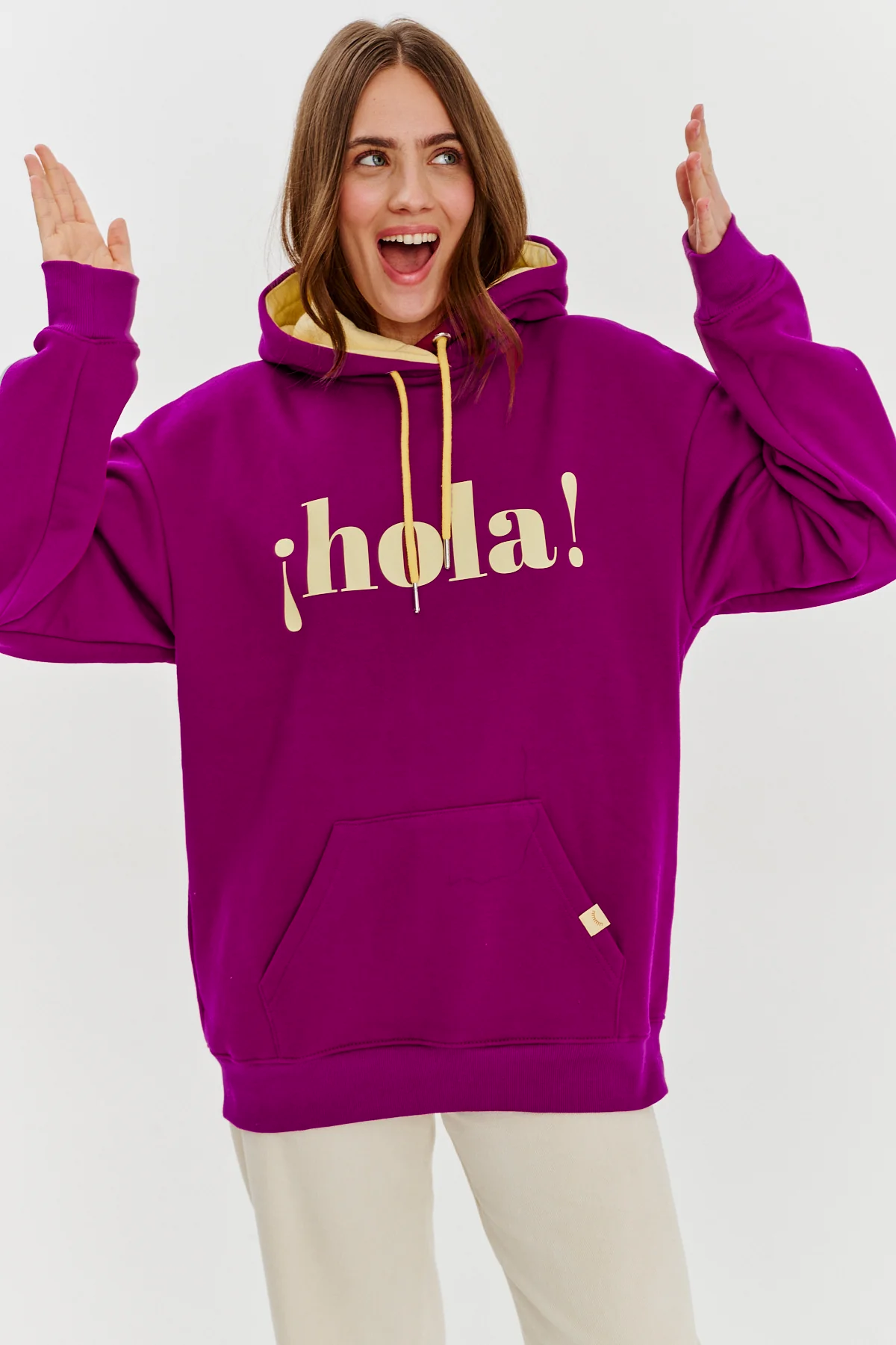 Hola Hermosa hoodie is an energetic mix of Spanish temperament and unique style. The deep purple color is broken with contrasting cream lettering - ¡Hola! on the front and ¡Adiós! on the back, which adds to its character and slightly feisty expression. The oversize cut provides a comfortable and enveloping fit, while the large hood finished with a light interior adds a subtle contrast.