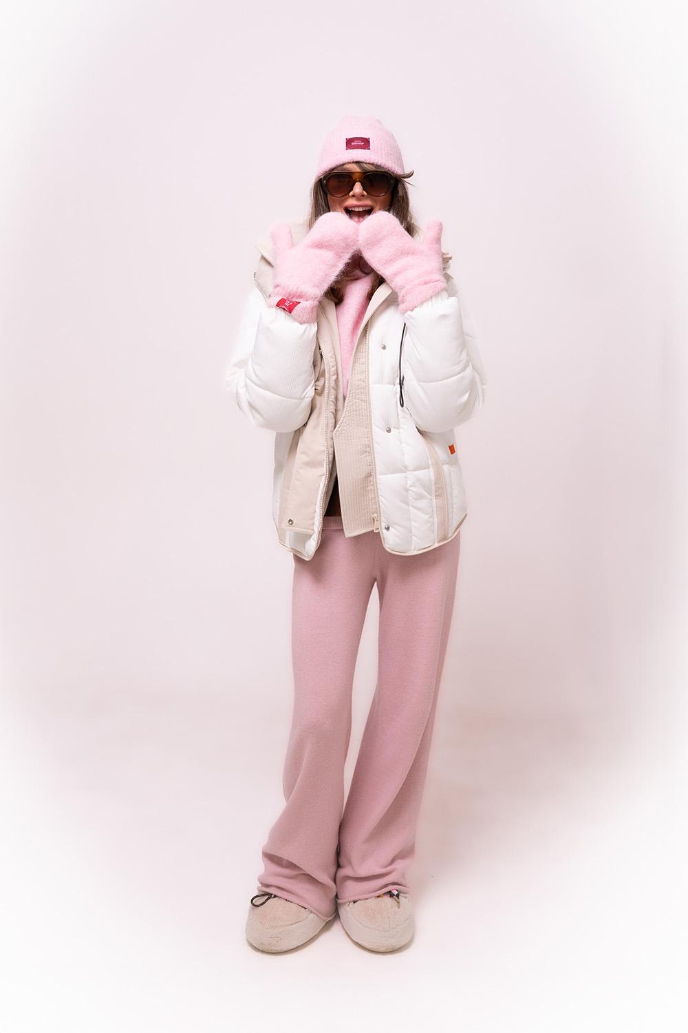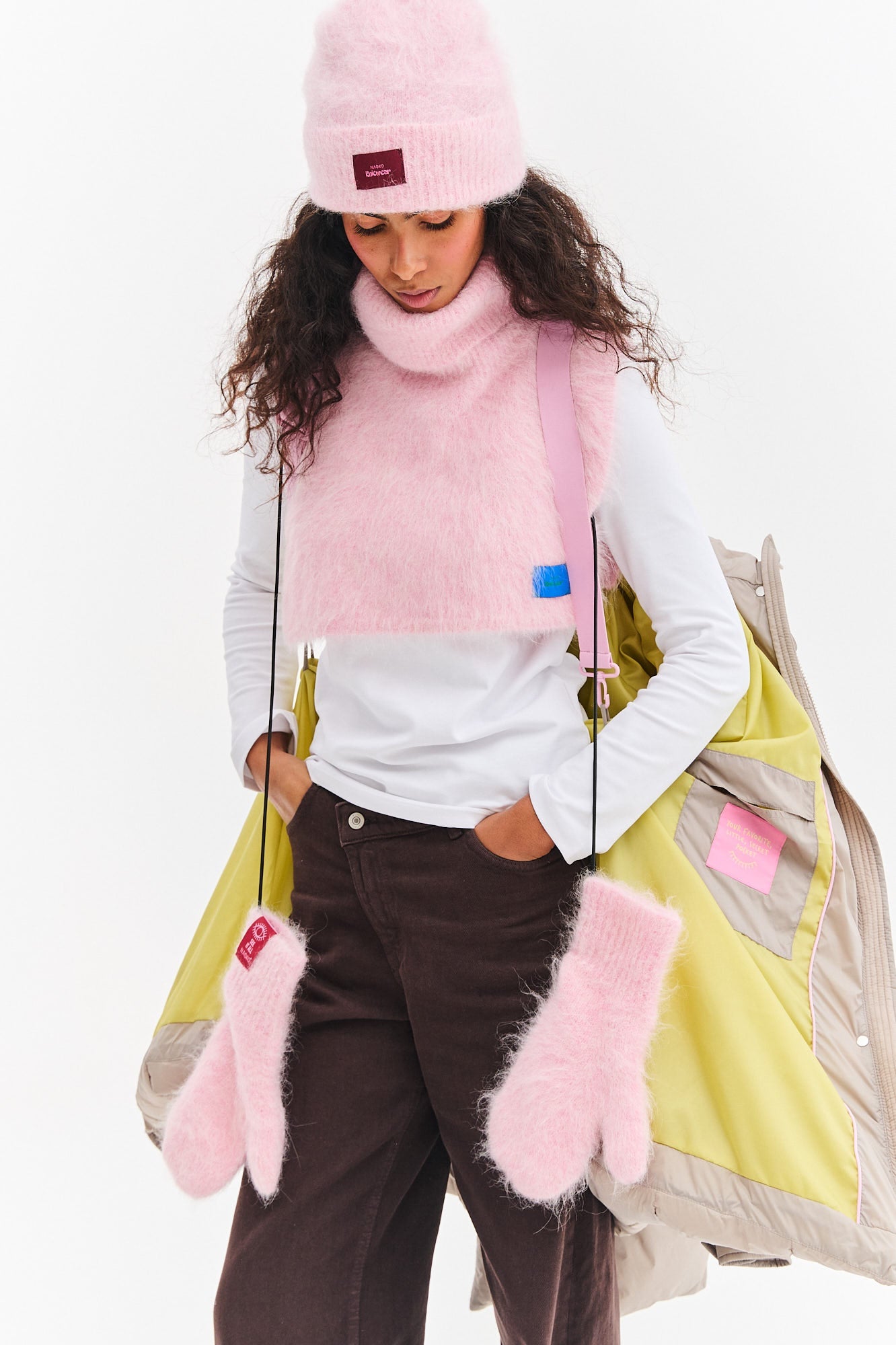 The delicate, "Blush" pink color pairs beautifully with many coat shades – from grey and beige to navy. They are the perfect complement to a winter look, especially when combined with the hat and collar made from the same fluffy knit.