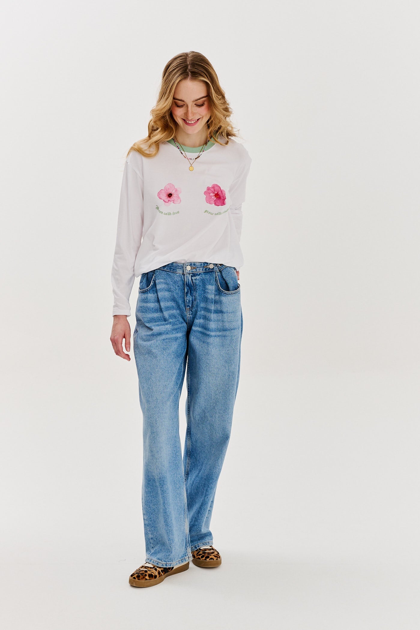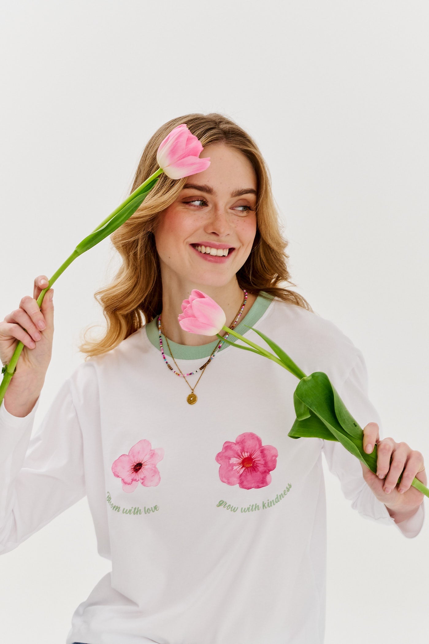 Kindly Bloom longsleeve is the quintessence of subtlety and feminine charm, inspired by nature and positive energy. The delicate floral print in pastel shades symbolizes tenderness, and the embroidered message “Bloom with love, grow with kindness” reminds us of the strength inherent in gentleness. The soft cotton fabric wraps you in comfort, while the olive finish on the neckline adds a subtle, natural touch.