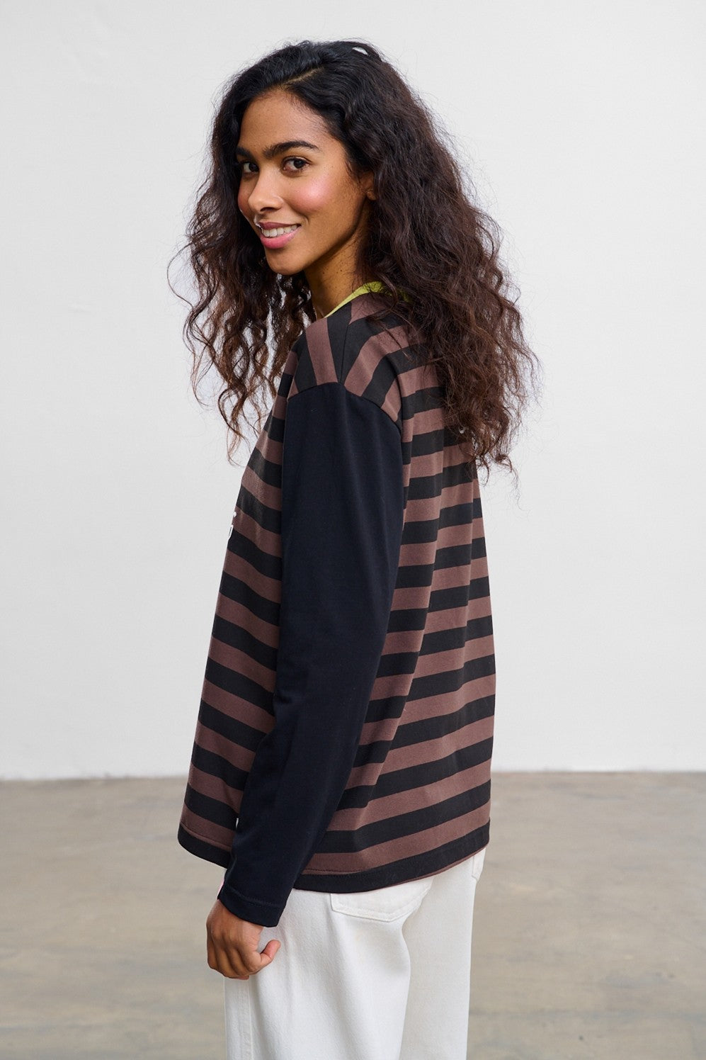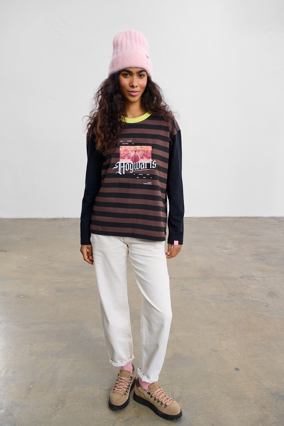 The Hogwarts Longsleeve is for those still waiting for their Hogwarts letter but don't want to sacrifice style. Dark, horizontal stripes give the blouse a grunge feel, while the contrasting lime green neckline adds a modern twist. The focal point is a Gothic inscription and atmospheric graphics referencing the Harry Potter saga.