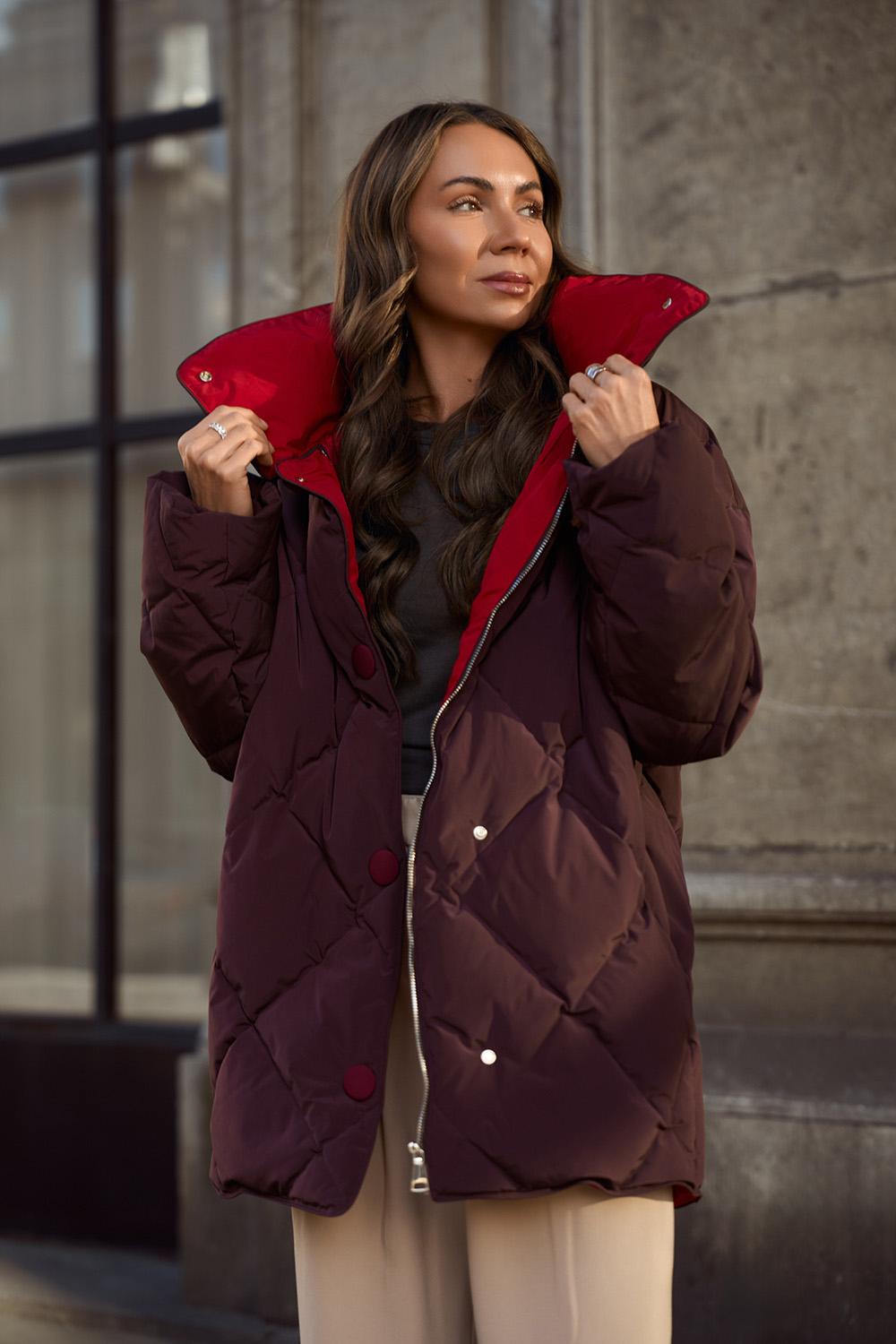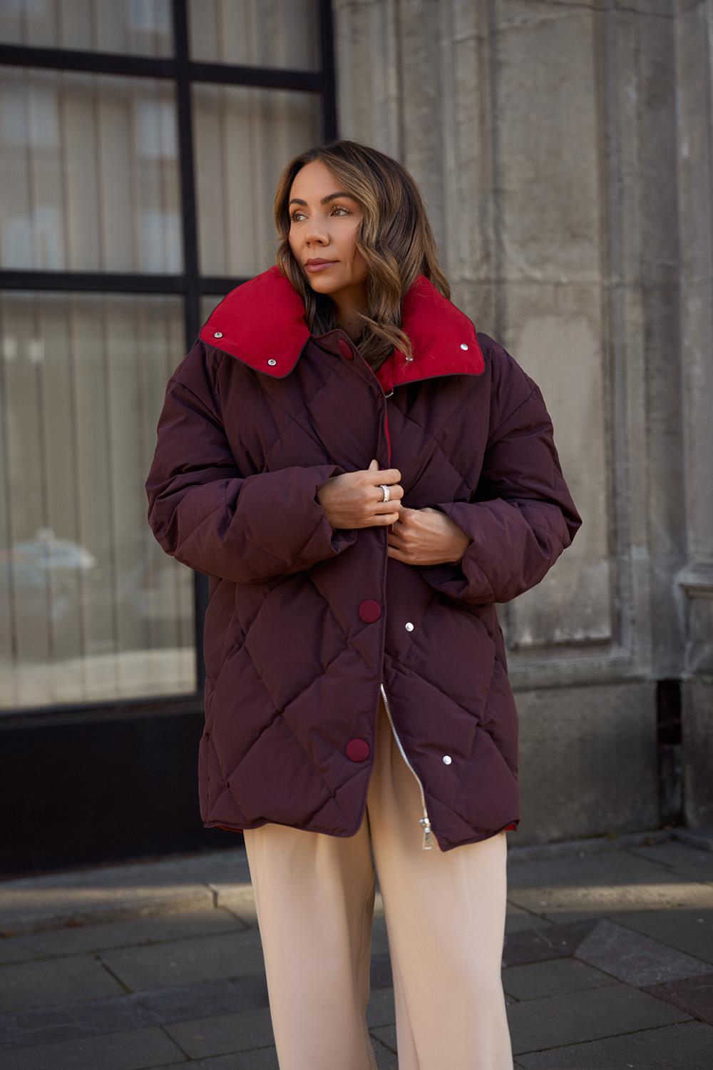 Maroon quilted jacket with a stand-up collar