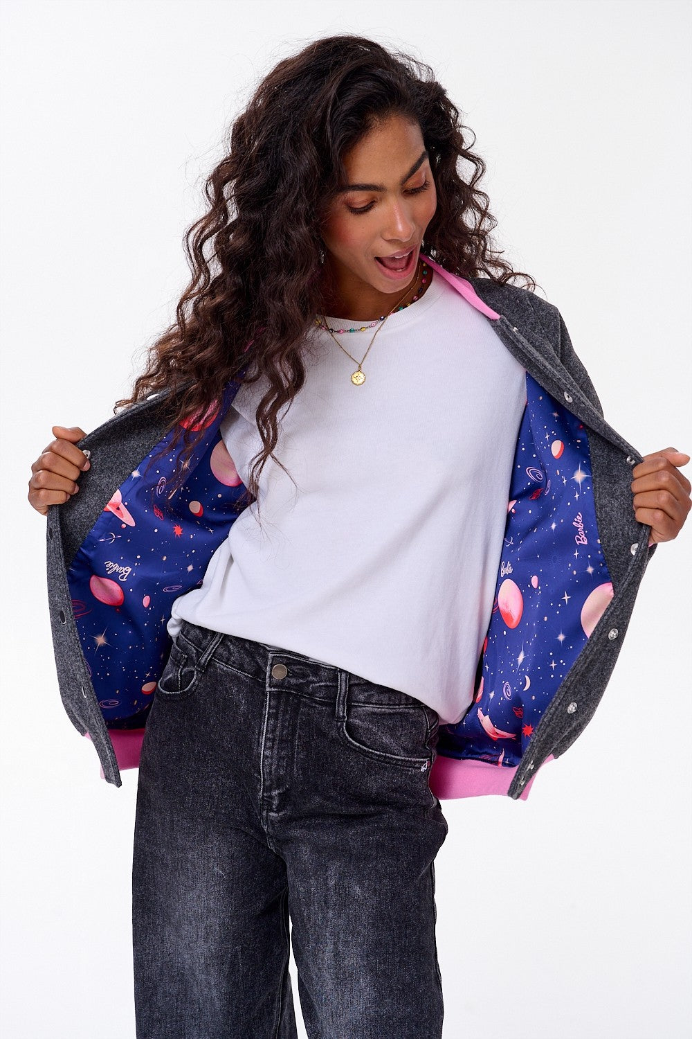 Out of This World Bomber Jacket is perfect transitional jacket for any space fan. Its classic dark bomber cut is livened up with vibrant pink details and prints. Snap closures and slanted pockets emphasize its retro style.
