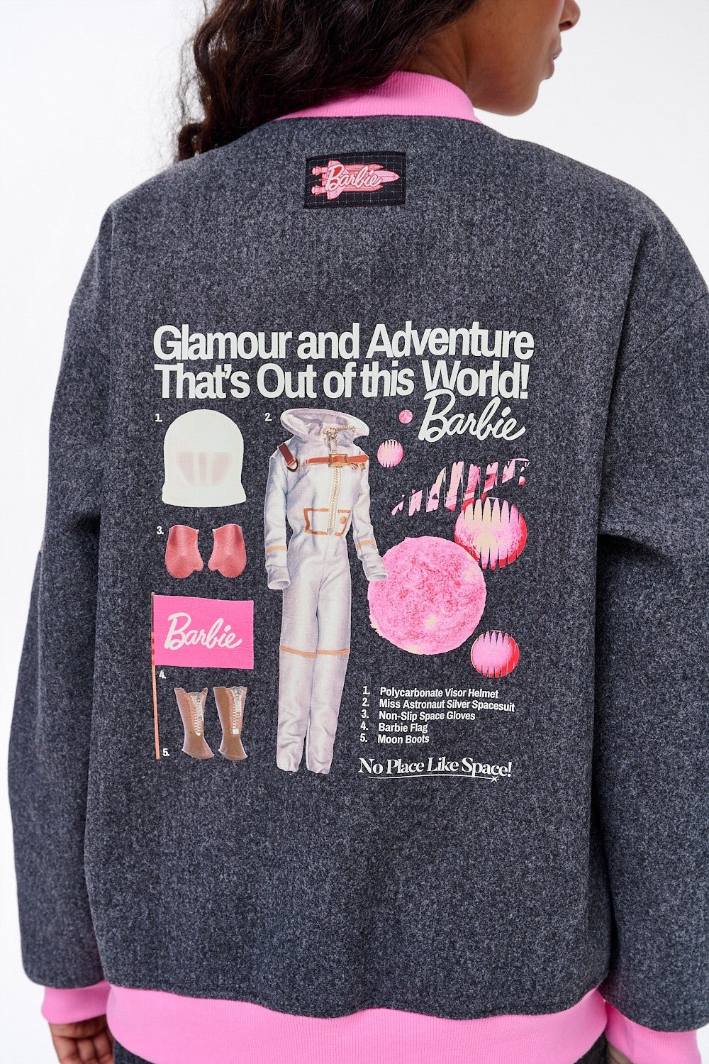 What sets it apart is its richness in detail. On front and sleeves, you'll find a collection of symbols inspired by space missions. back is adorned with a large, colorful print depicting Barbie™ astronaut gear.