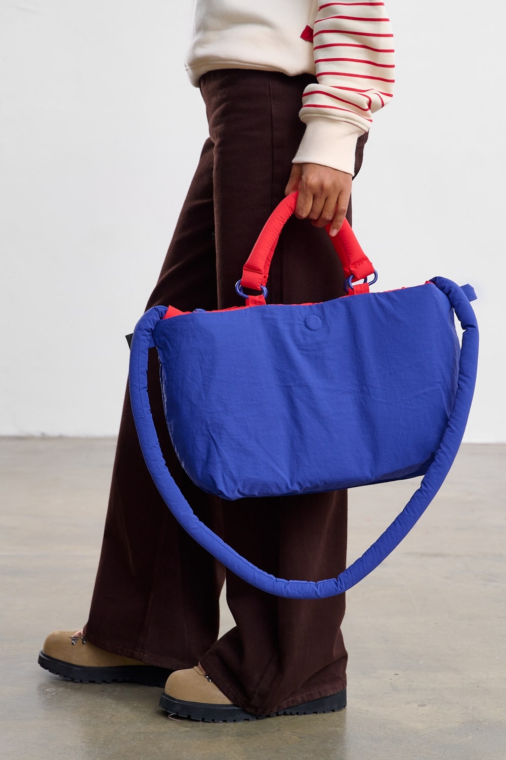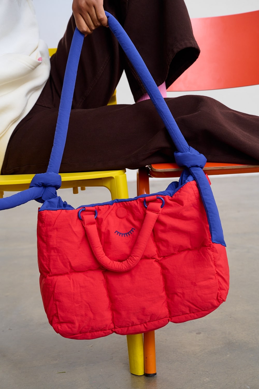 The soft, "fluffy" texture makes the bag not only stylish but also incredibly lightweight. It can hold everything you need throughout the day. It has two sets of handles – short coral handles and long purple shoulder straps, finished with fashionable knots.