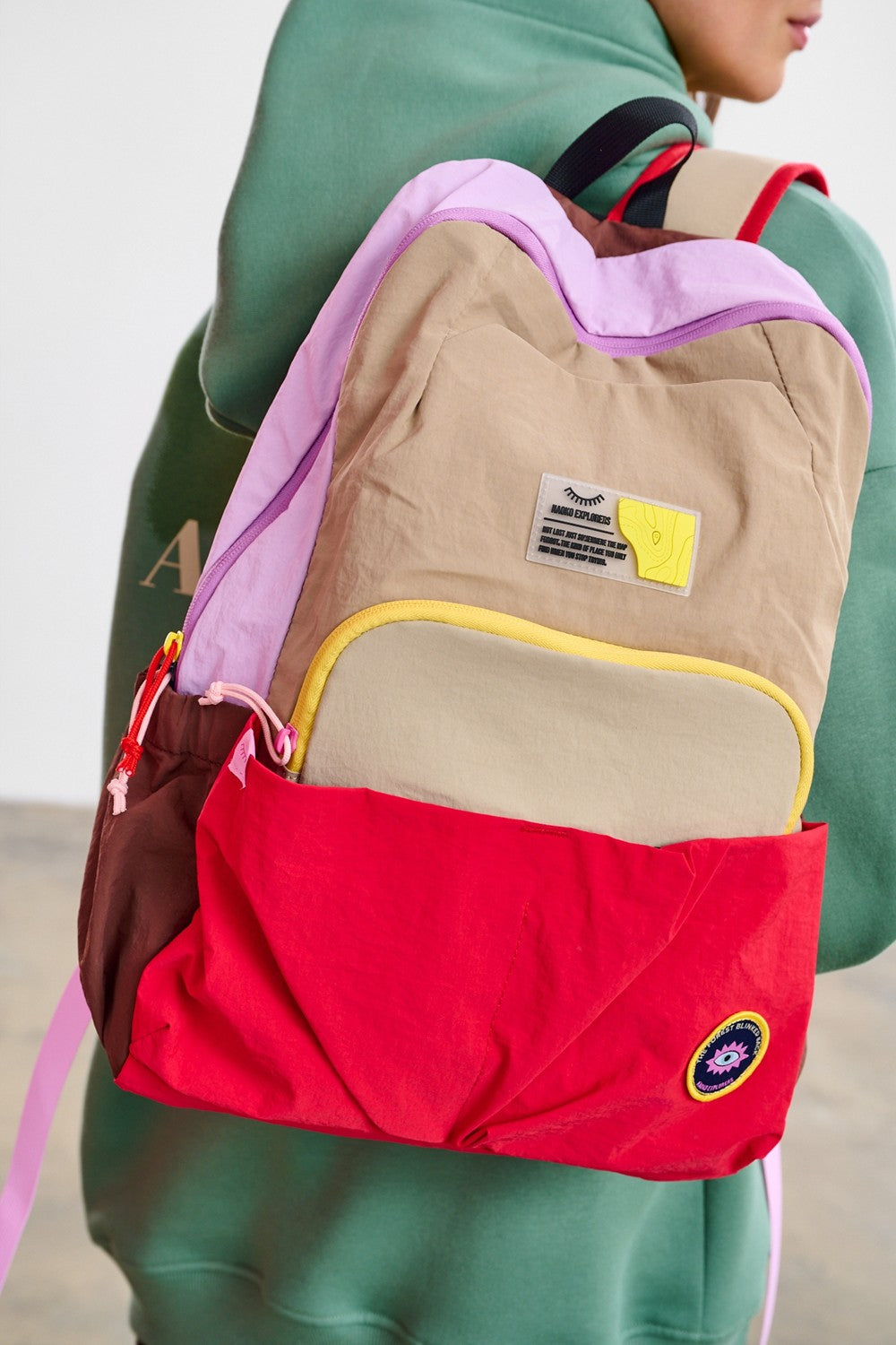 Vivid Vibes backpack is a practical take on color. The design features shades of beige and brown, dynamically broken up by a large red pocket at the front and purple accents on the straps and zippers.