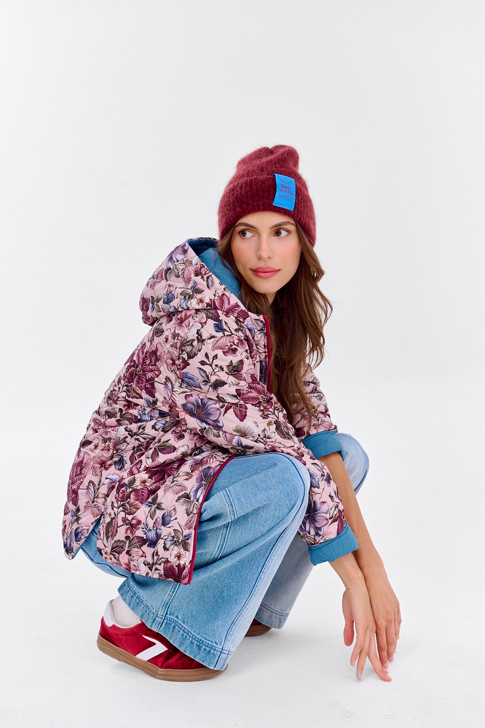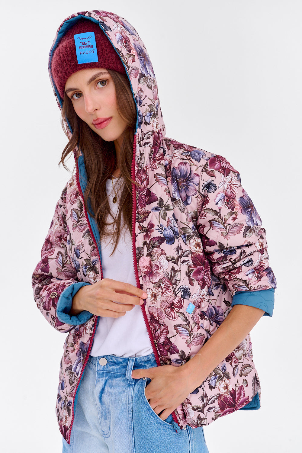 Poppy Mystic Garden reversible hooded jacket is a statement of courage and style for fall and winter days. One side features a muted blue color broken up by contrasting stitching and floral trim, while the other side has a floral pattern. The classic hooded and quilted design creates an ultra-comfortable, enveloping fit that you can style in two ways, depending on your mood or the weather.