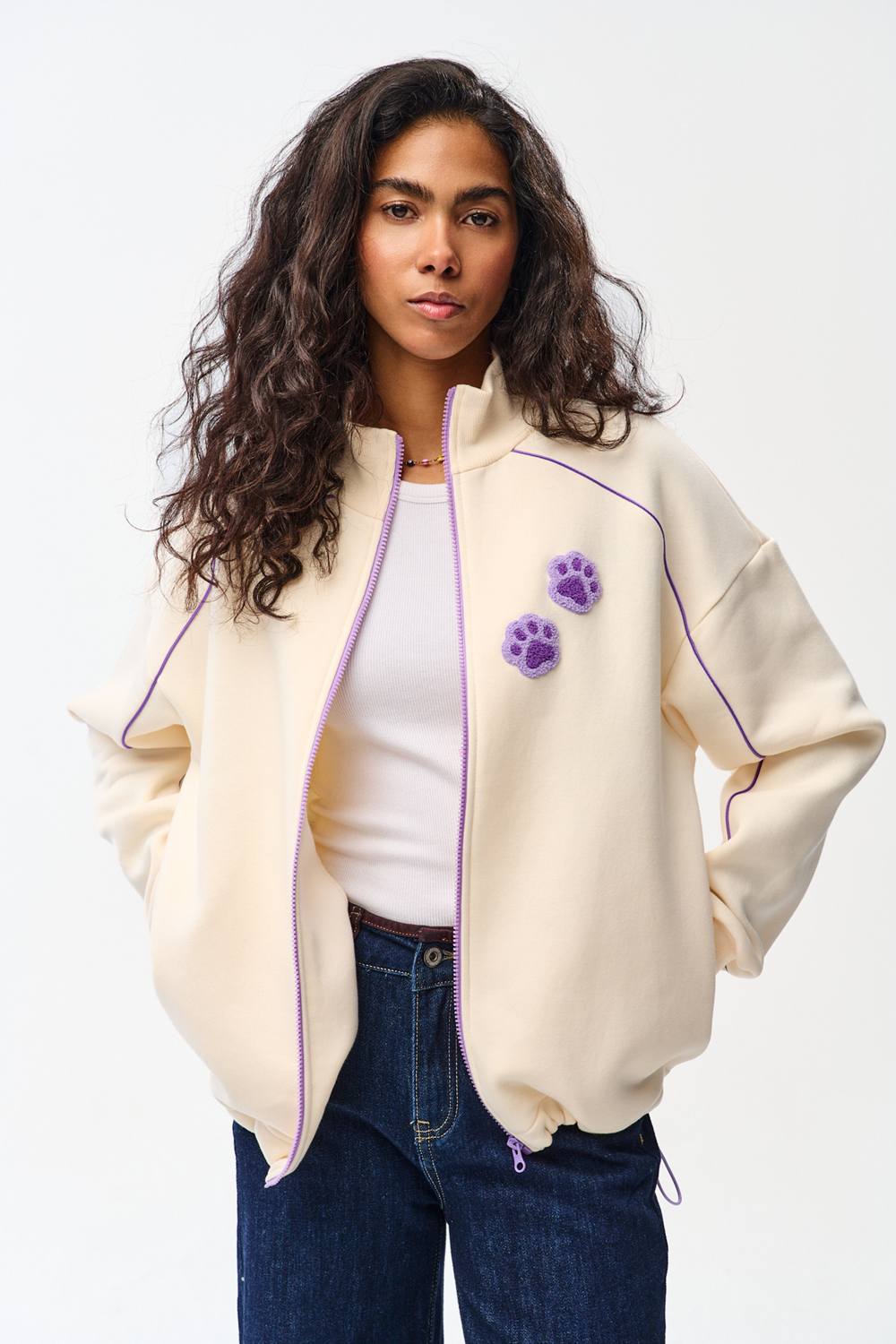 The Purrfect Excuse zip-up hoodie combines the softness of ecru with a playful cat paw print. Made from soft knit fabric and featuring a zipper that goes all the way up to the neck, it provides perfect protection against the cold. The embroidered "chenille" details give it a unique texture.
