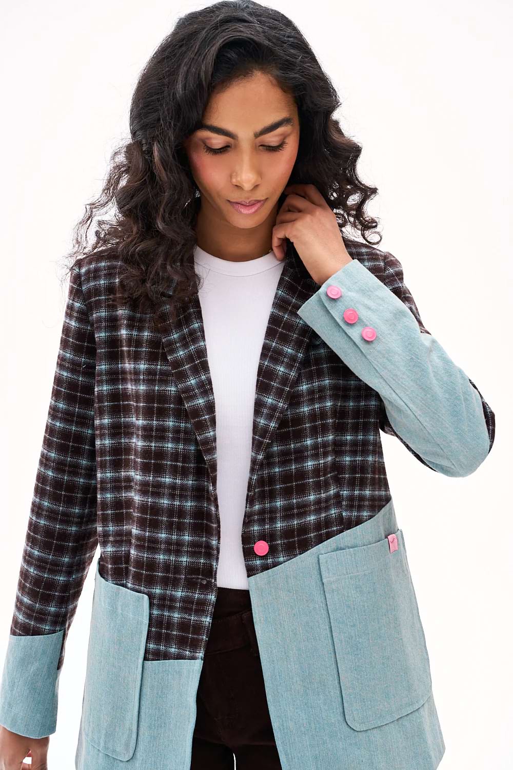 Quiet Thunder blazer is a design for women who like to break the mold. The upper section, made of brown checked wool, contrasts with the lower section and sleeves made of light denim. This clash of two worlds – elegance and streetwear – creates a unique, asymmetrical whole.