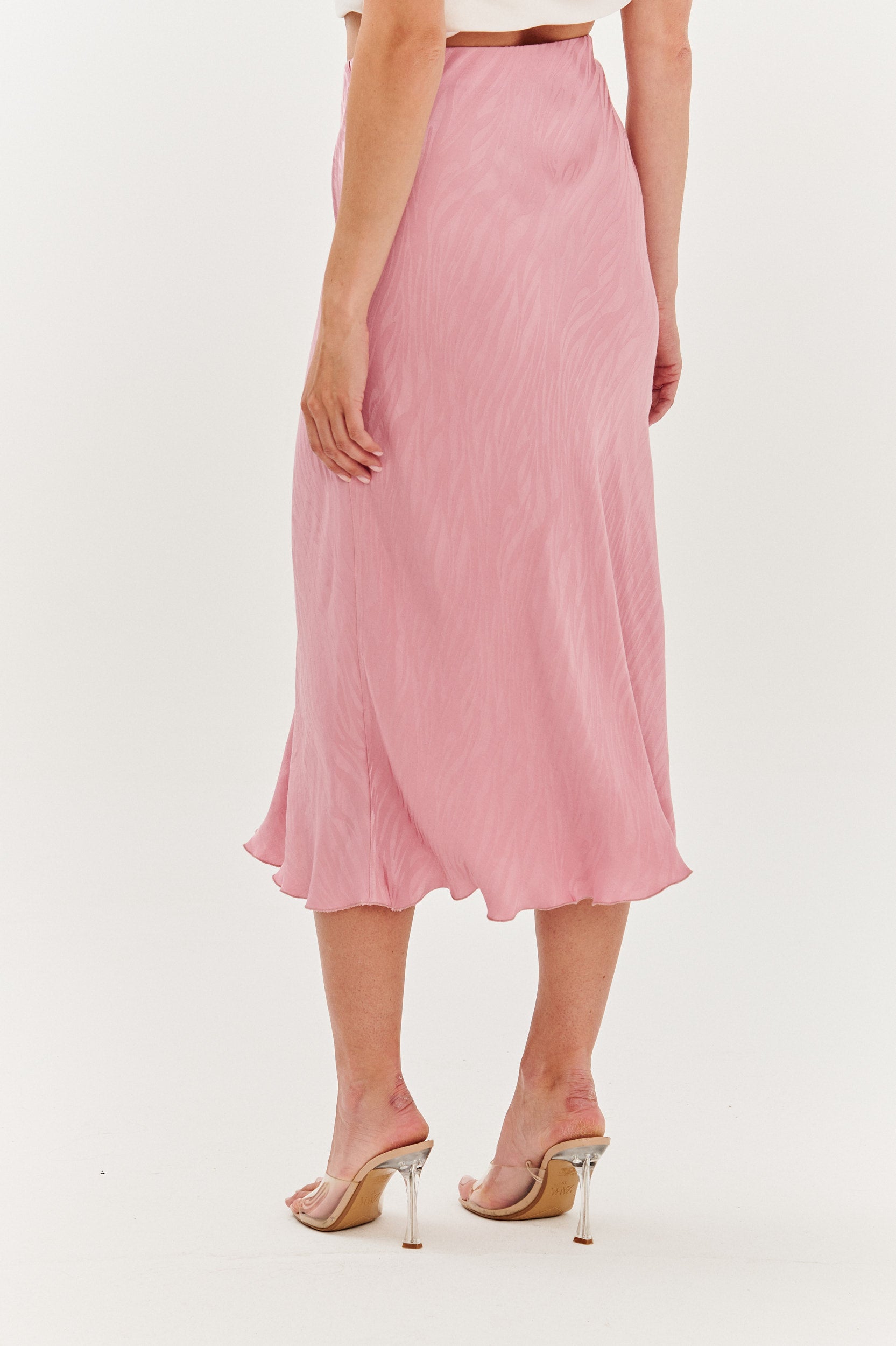 Rosewater Breeze midi skirt is for those who like subtlety with character. Made of softly shimmering viscose with a light jacquard pattern, it sits softly on the silhouette and moves with every step. The shade of powder pink adds to its freshness, while easily fitting into everyday and more elegant outfits.