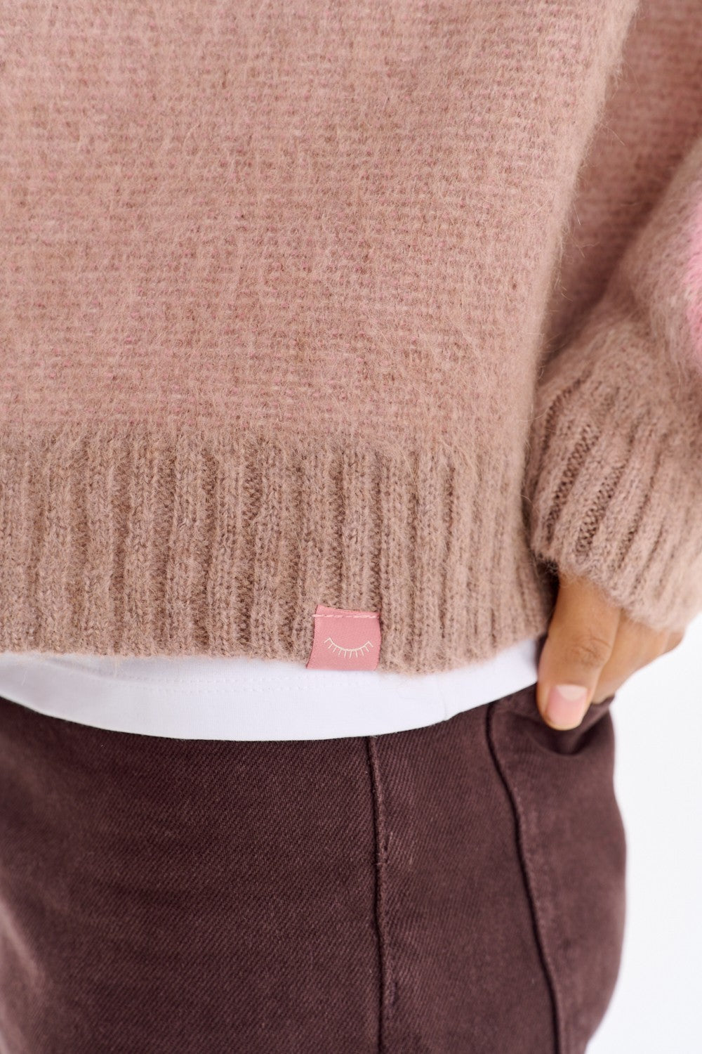 The Softspoken mohair sweater is the perfect companion for any fan of the "dark academia" style. It delights with a classic diamond pattern in muted brown and pink colors. The asymmetrical pattern on the front gives it a modern touch.