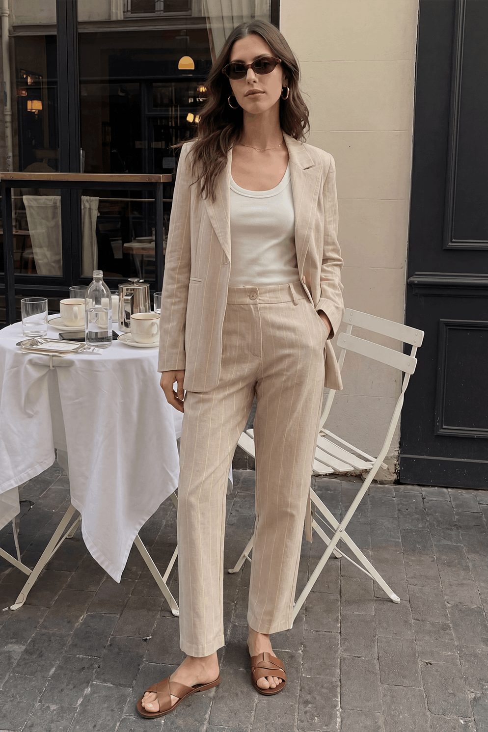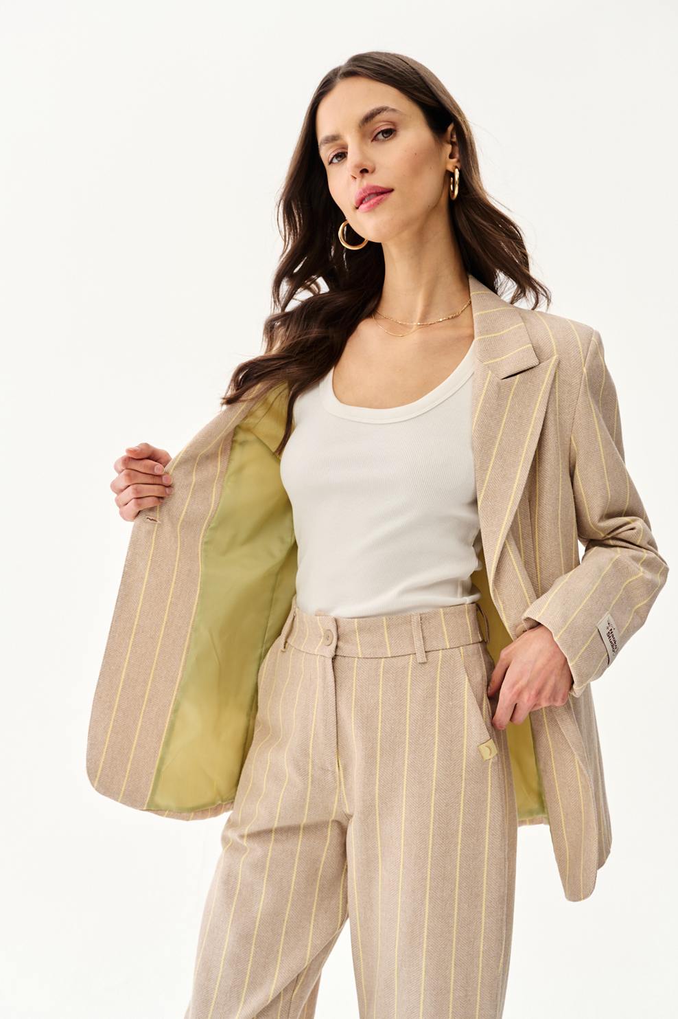The Spring Break blazer is the definition of modern minimalism. Light beige fabric with subtle stripes and a contrasting green lining are the details that make a difference. The single-breasted closure and precisely cut lapels give it a professional touch while maintaining the lightness typical of the City Breaks collection.