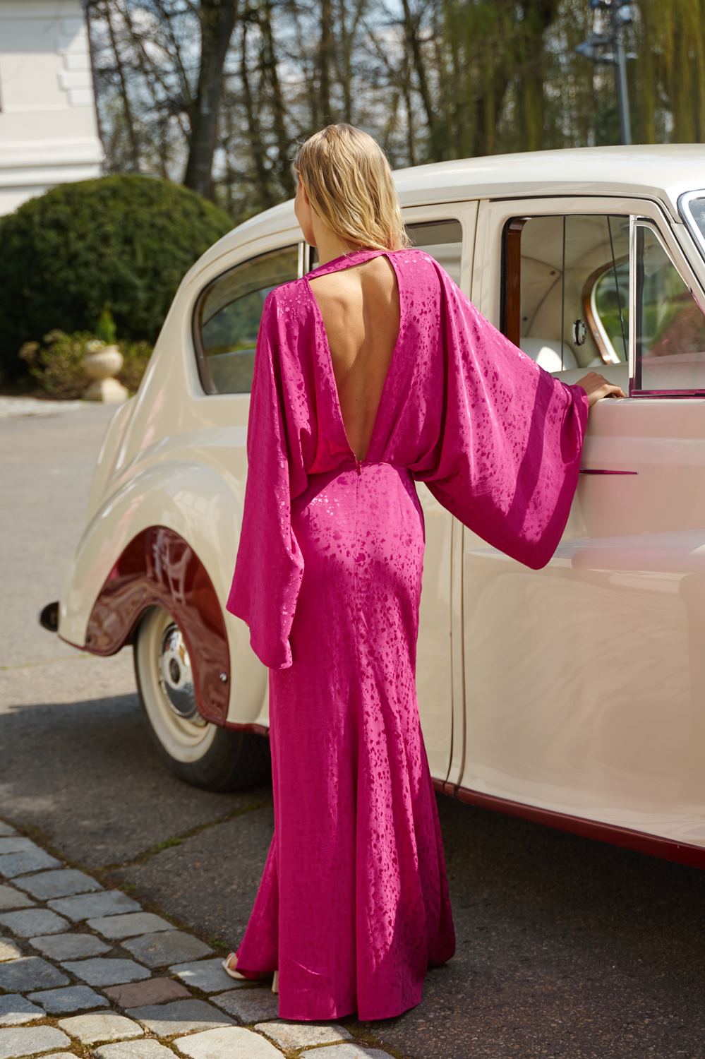 Blooming Fuchsia maxi dress is an elegant and feminine creation that stands out with its beautiful pink hue. The jacquard fabric with delicate embossing adds a distinctive touch and will make you feel special in it.