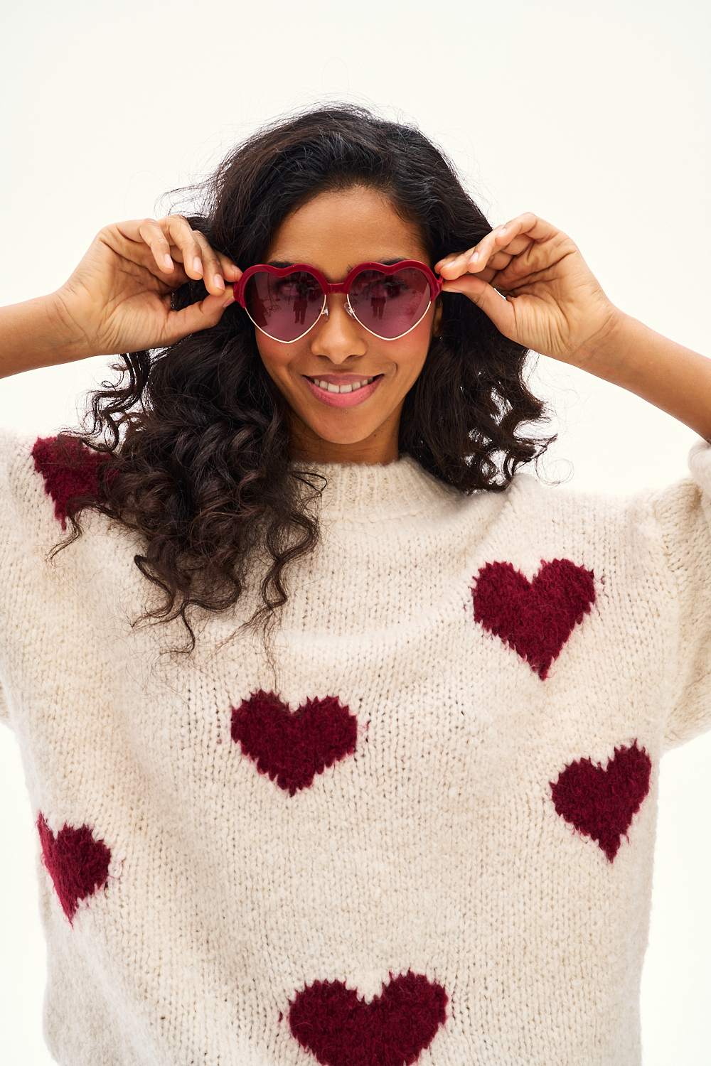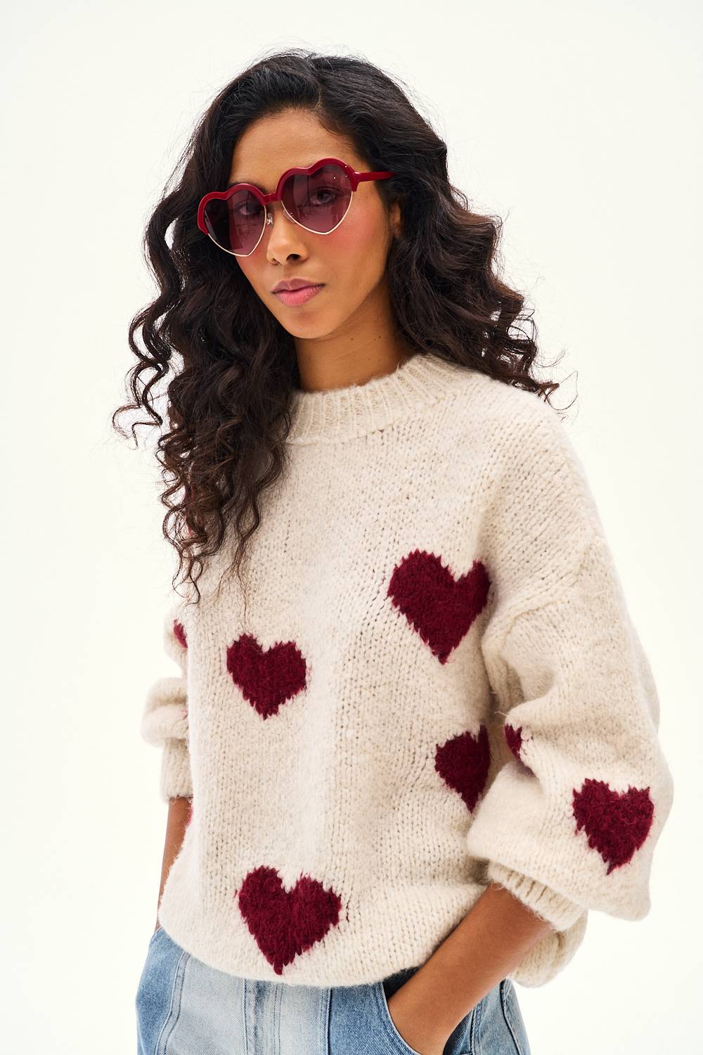 The Vanilla Ice sweater is the epitome of coziness. Burgundy hearts look elegant against the Off White background, lending the look a romantic touch.
