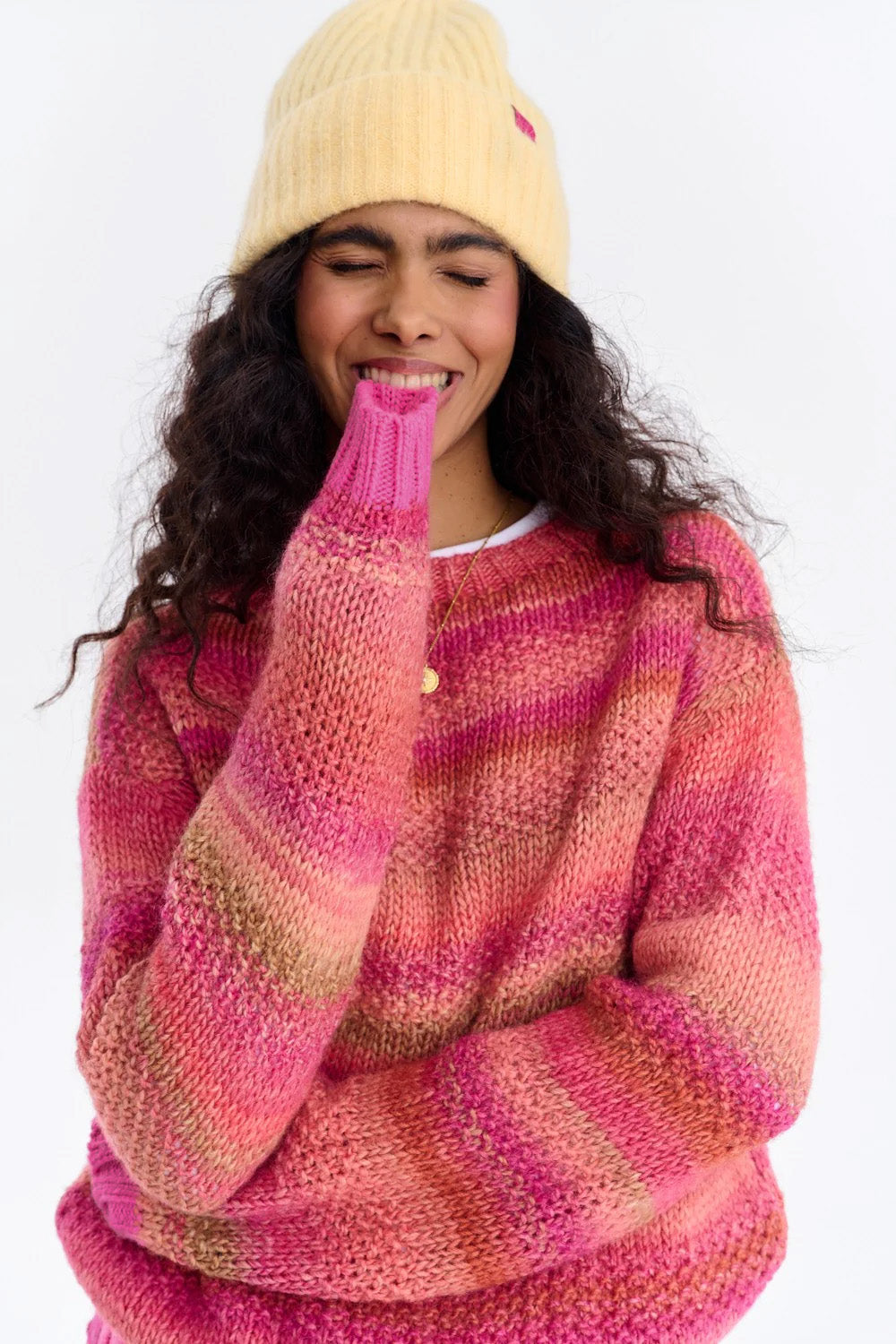 Desert Whisper sweater is the perfect companion for autumn chills. Its earth-toned color palette combines various shades of brown, beige, and orange, creating harmonious stripes. The unexpected accent is the intense pink finish on the cuffs and hem.