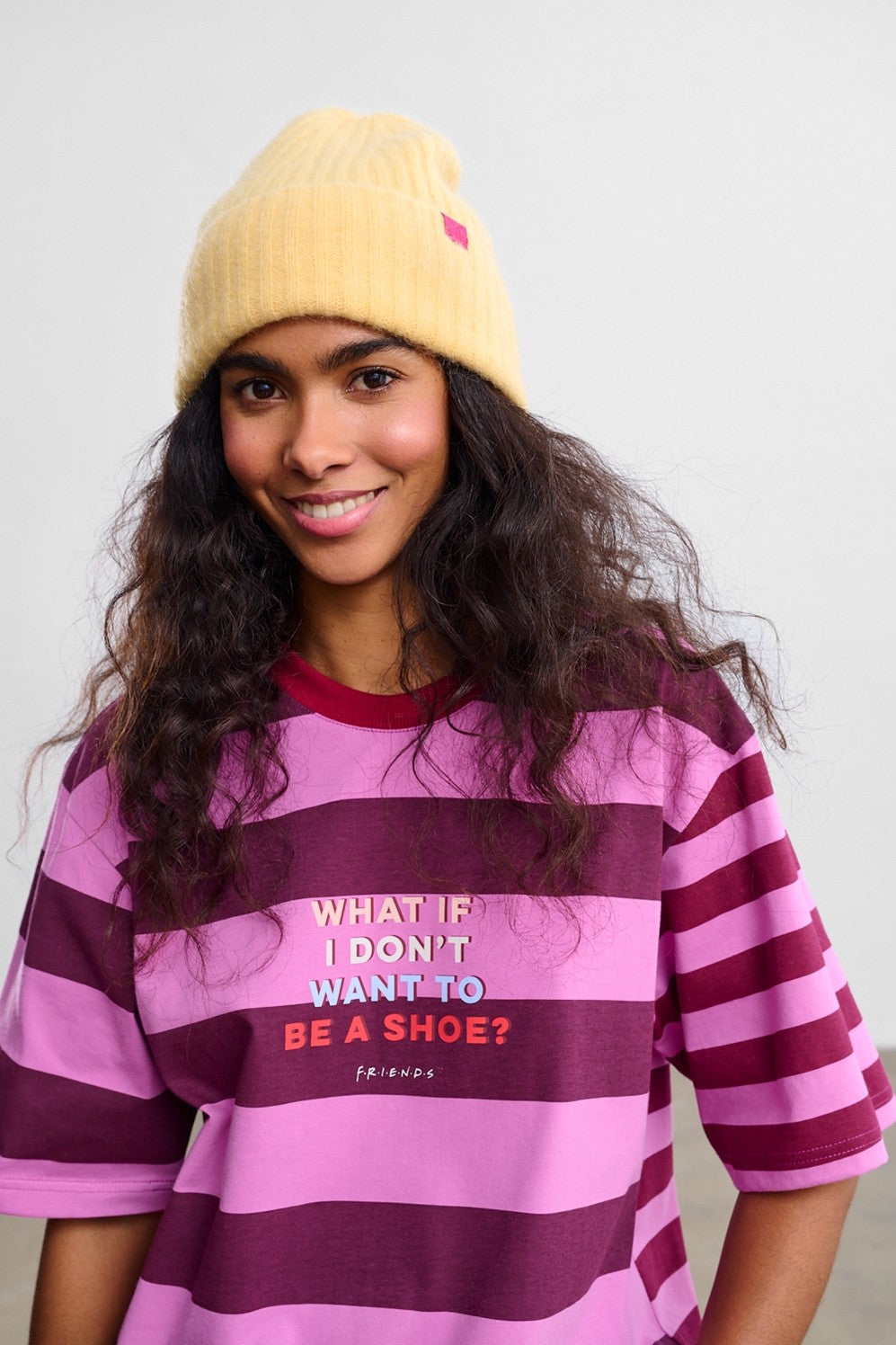 The No Shoe T-shirt is for women who value individuality. Purple stripes and red piping create a feminine yet expressive base. The front features the inscription: "WHAT IF I DON'T WANT TO BE A SHOE?", referencing Rachel's famous monologue.