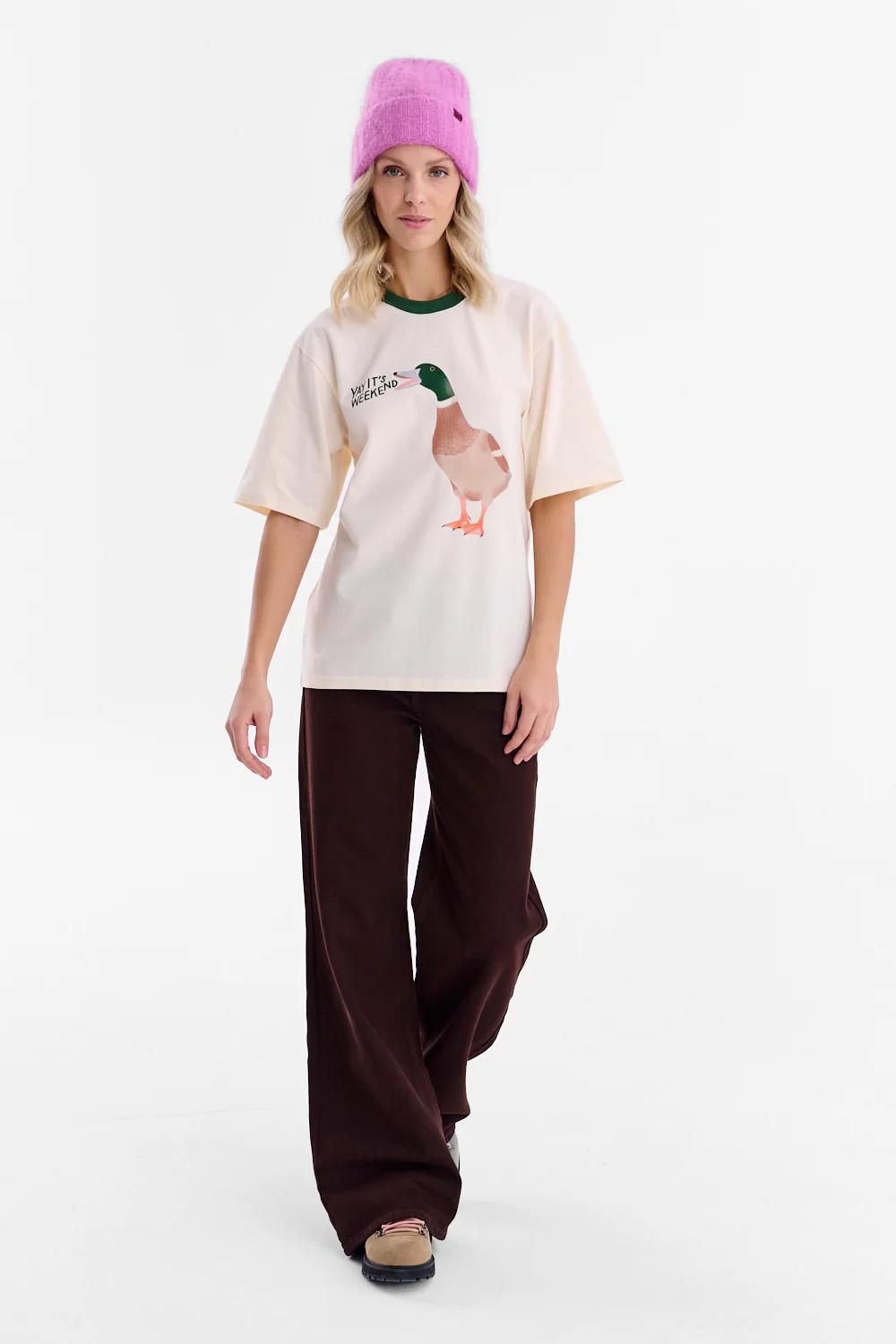 The Wild Quack T-shirt is a dose of Scandinavian humor straight from Cecilia Petterson. As part of the Naoko x Artist Remix project, the Swedish illustrator has created a T-shirt that perfectly captures the joy of free time. The cream T-shirt with a contrasting green neckline is a great base for casual outfits.